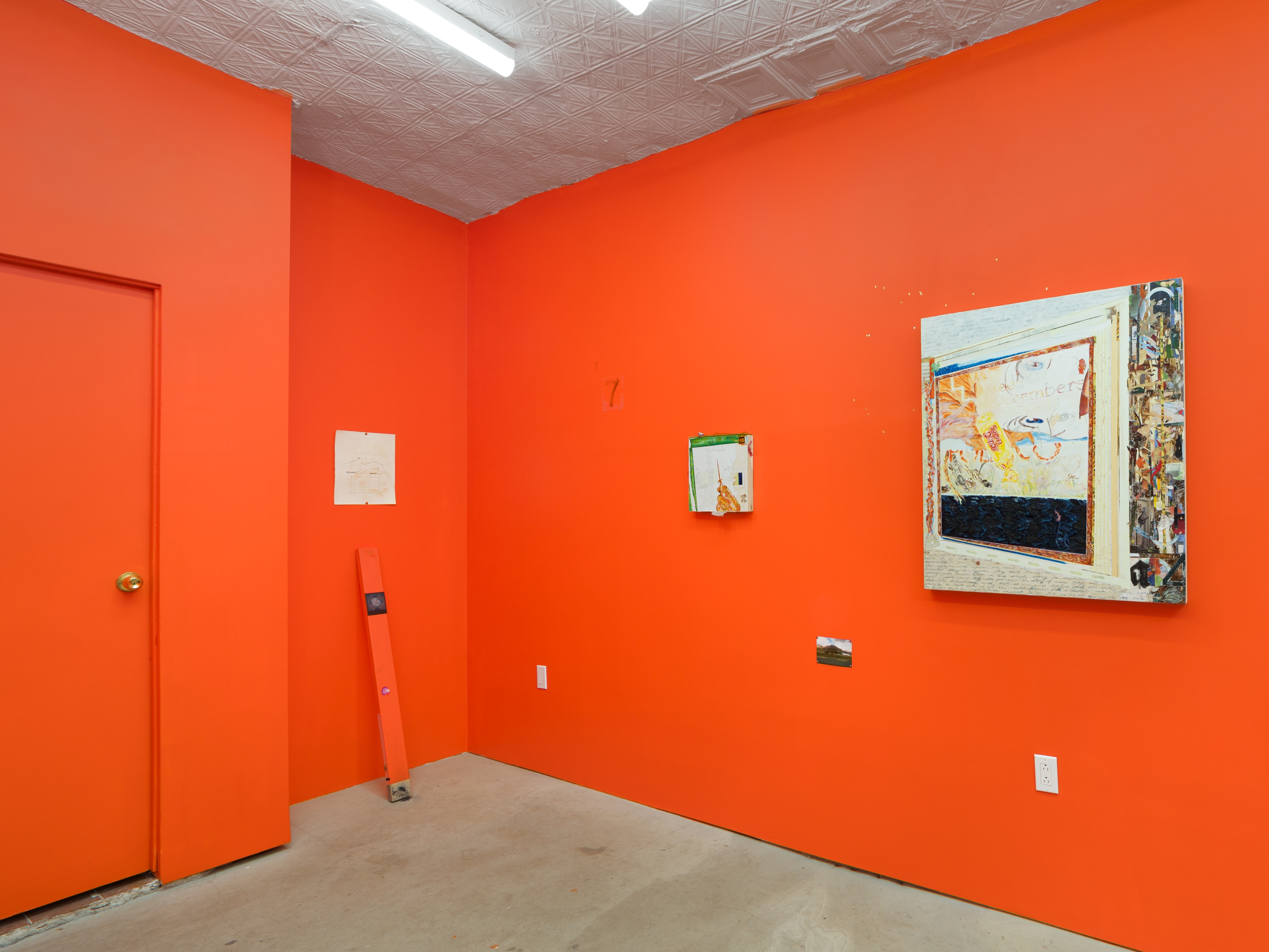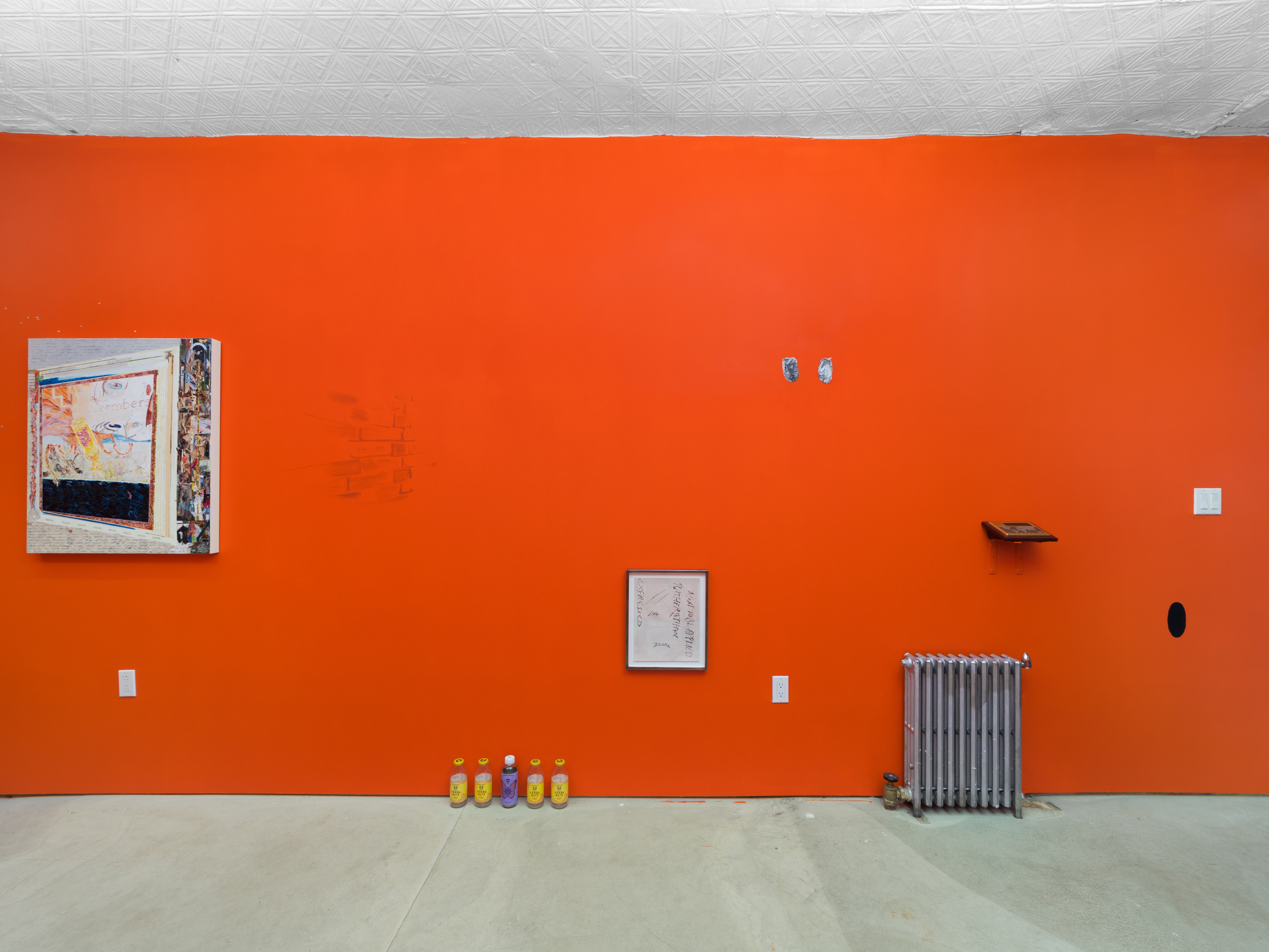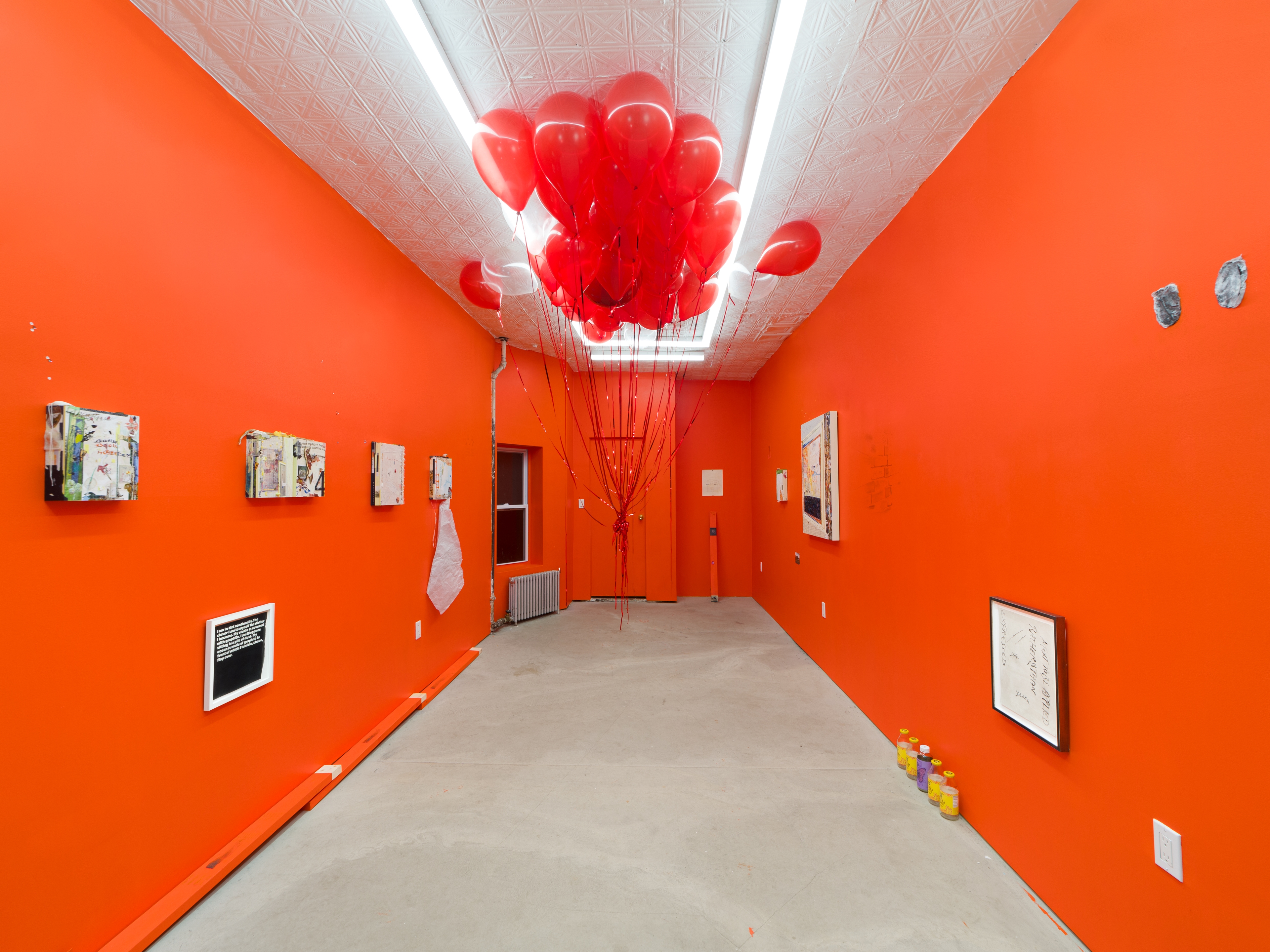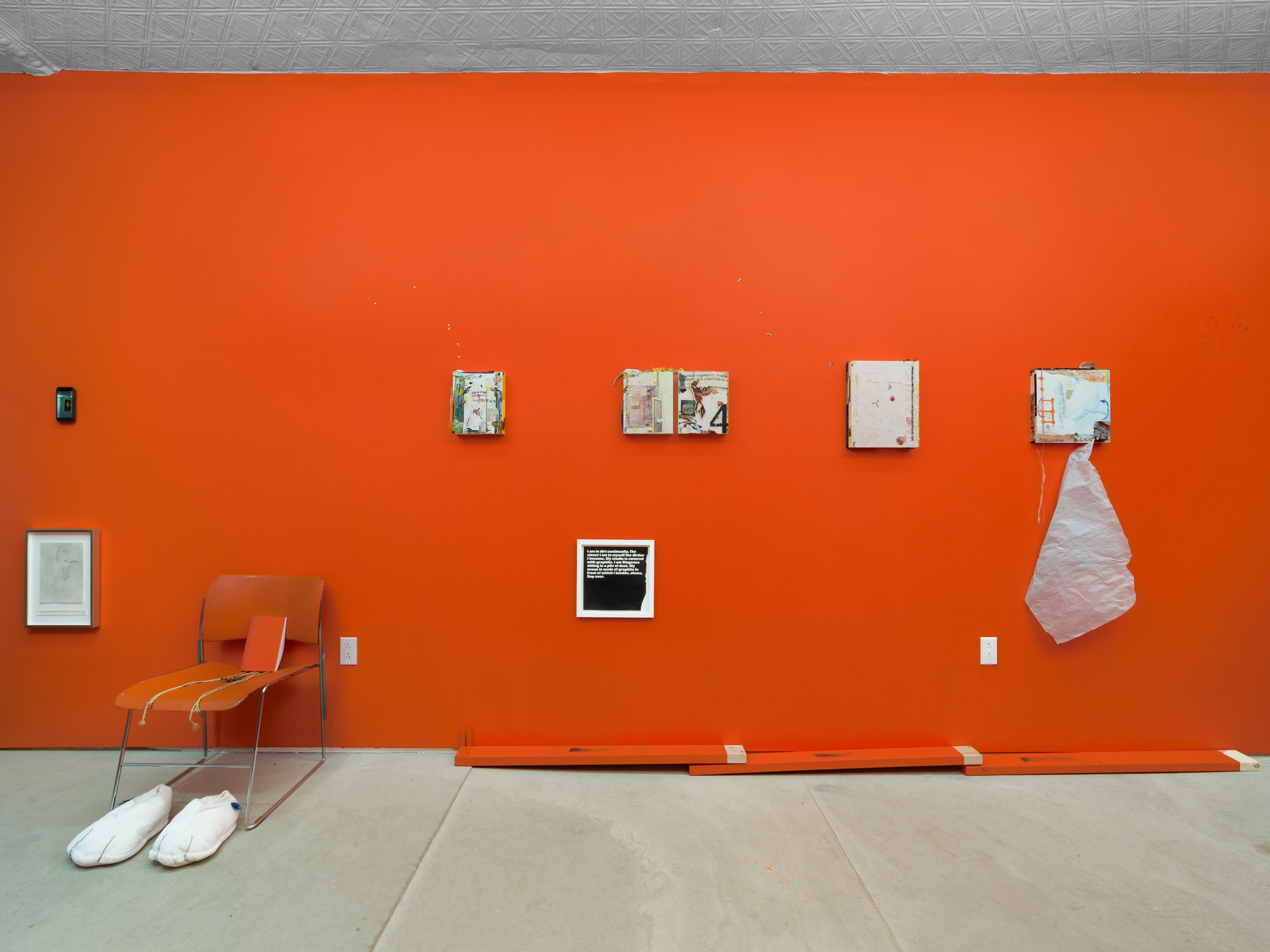 You may notice that it would be fair enough to say that this is a show of paintings. One could run with that story, just as many painters today seem to prefer retreading the plains of illusionistic space as if the past 70 years never happened. Listen, you can call Paige many things, but never ahistorical. Her works breed in a barnacled, fluid environment, sweet and acid like juices of certain fruits, open for business like wounds to be operated on. As Corita Kent said in her 1966 essay “Doors Are Like Letters Are Like Love,” these works exist “somewhere in between singing and silent reading, somewhere in between Gutenberg and the image industries.” The commercialism of today’s culture assigns value based on likeness to known quantities, ergo the artist uses techniques and signifiers of ye olde original means of mass reproduction, publishing—that is, transcription and editing of texts into layouts, the ISO-approved standard A4 paper size. Her artworks often rope in documentation of her output, resulting in an off-serial process that constellates toward the elsewhere that’s been dragged back into the house like some old dug-up bones placed expectantly at our feet. Thank you my boy, but don’t stare at me with those ground-up ZERO pigment eyes like black holes. Walk away instead, like a best friend.