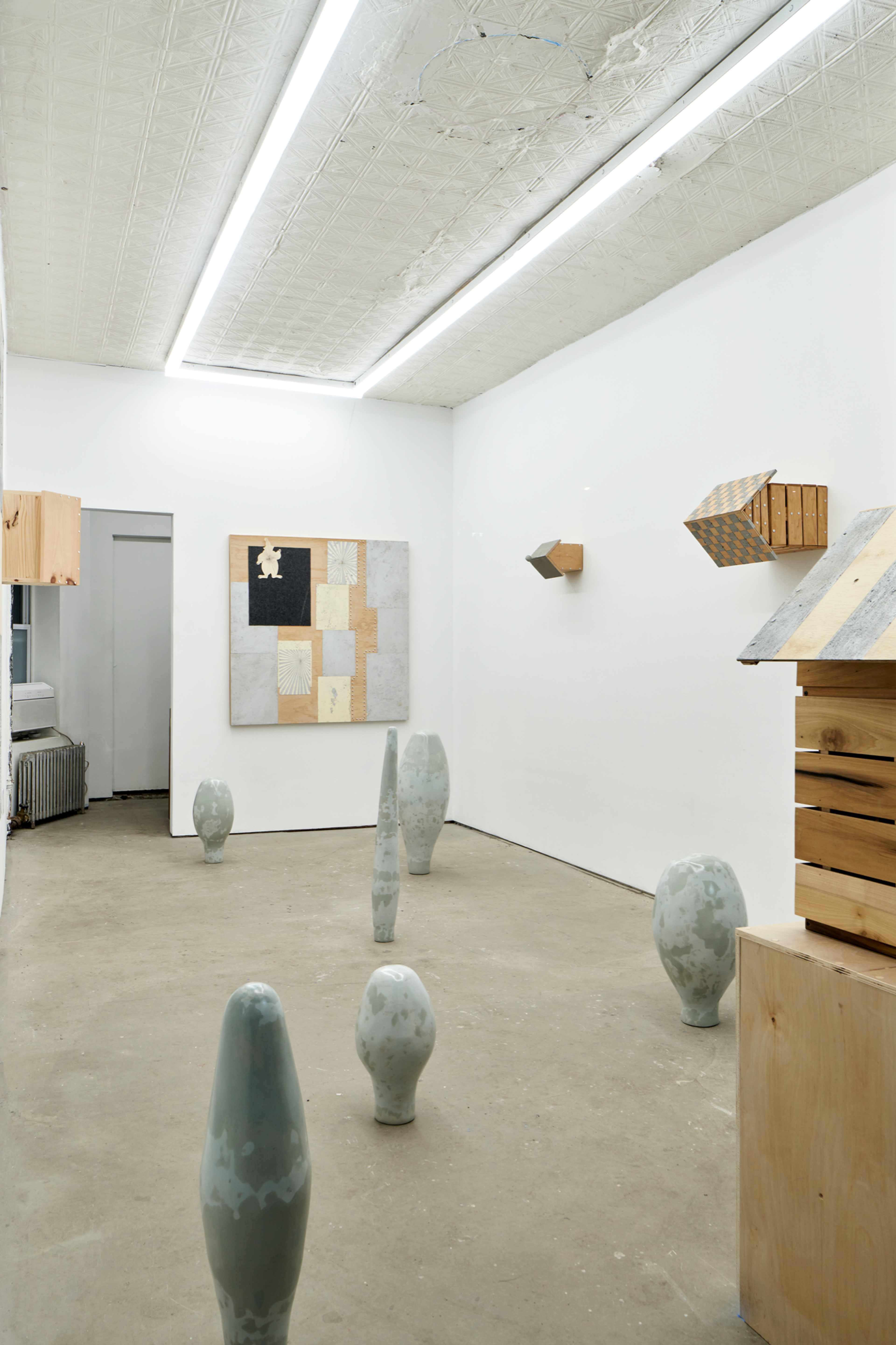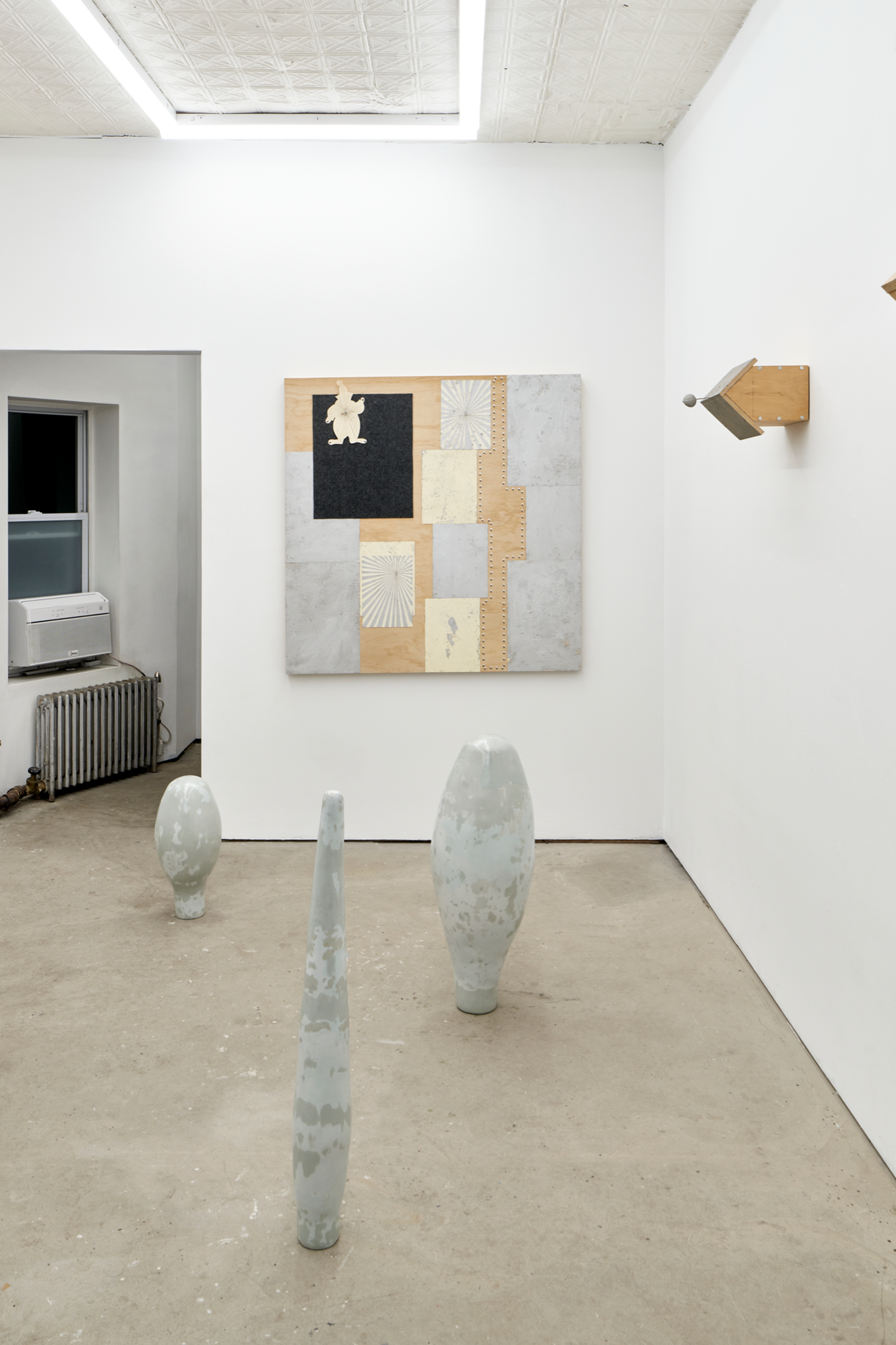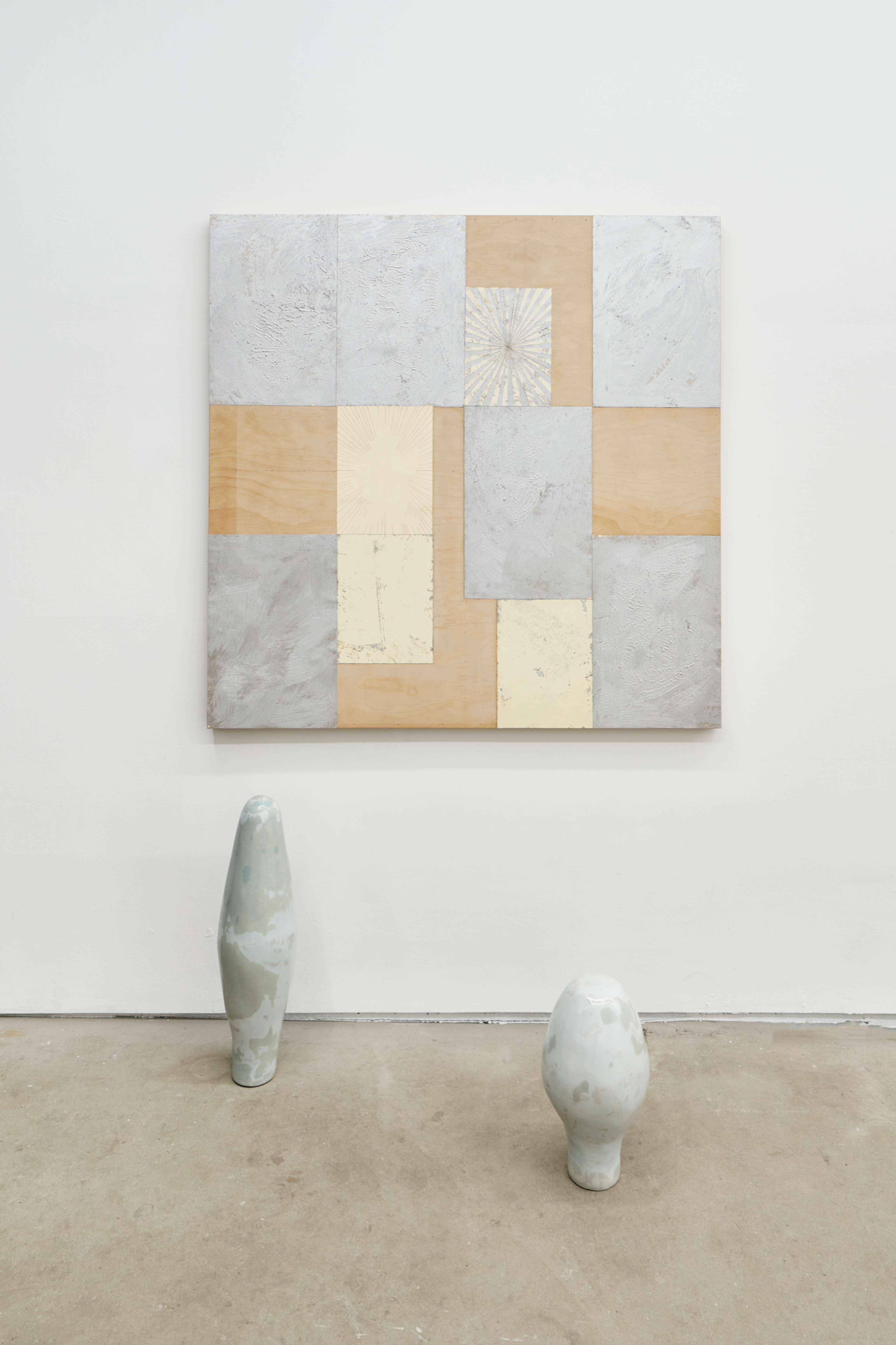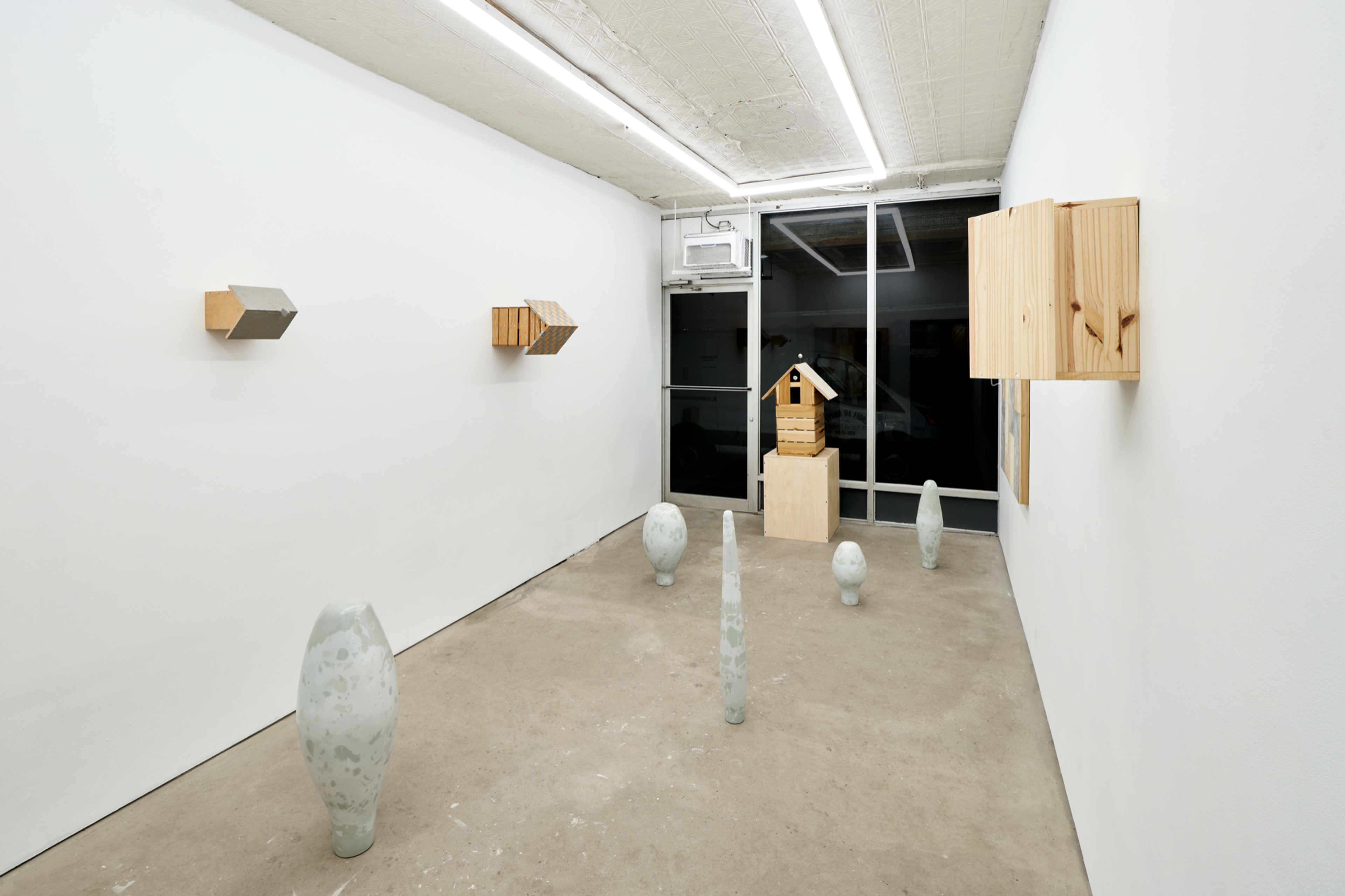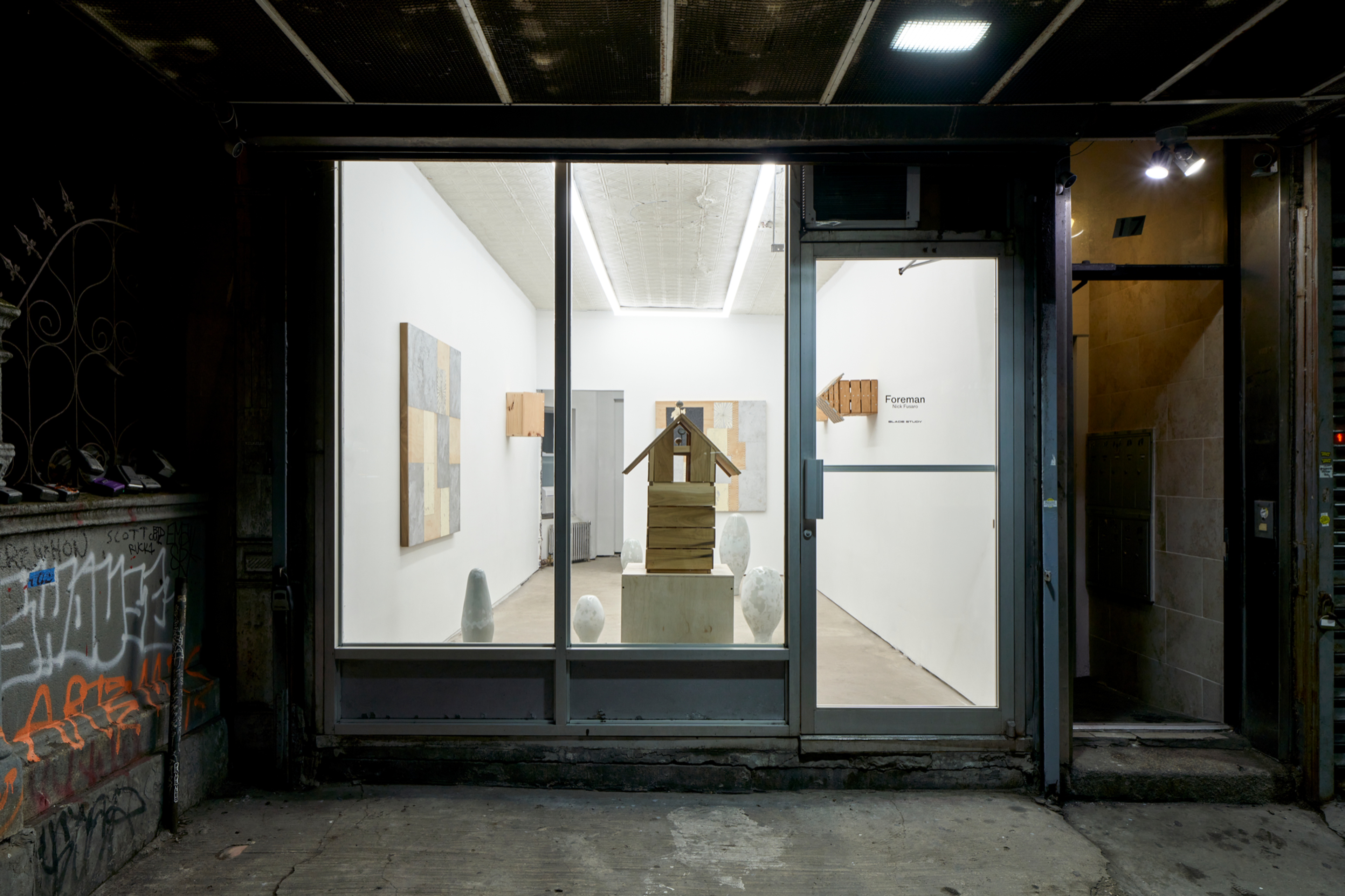 All of the artworks in Foreman are made using materials typically associated with building. The six nodules at the exhibition's center are made using epoxy and polyester resins, bonding agents used in construction, flooring, insulation, and repair. Aluminum is a recurring material in Fusaro's practice, appearing here in the form of roofing paint, where it is applied as a brushable material designed to seal and insulate the roofs of barns, homes, and garages. Wood is also used across artworks, appearing in varied states of finish and quality.