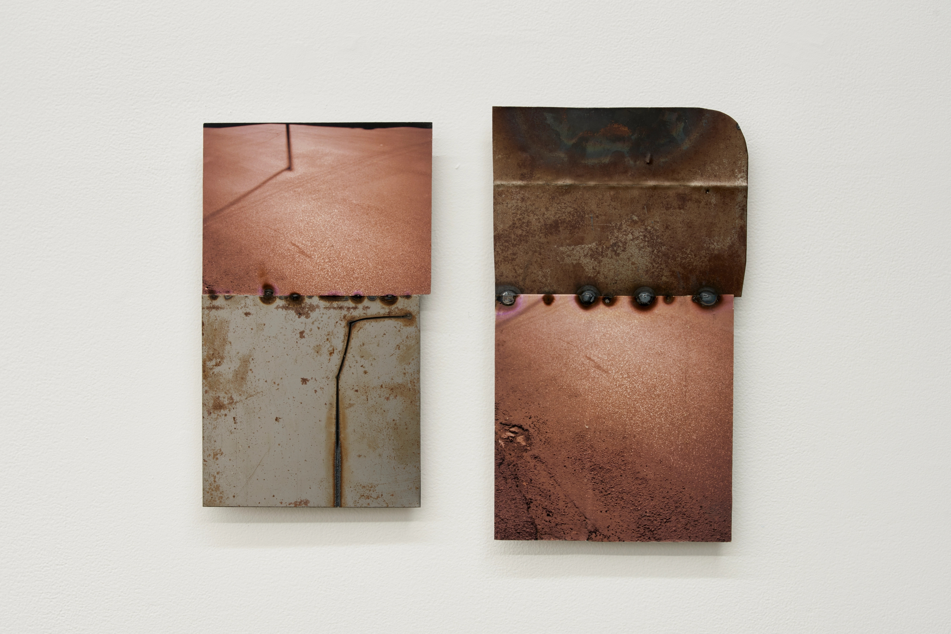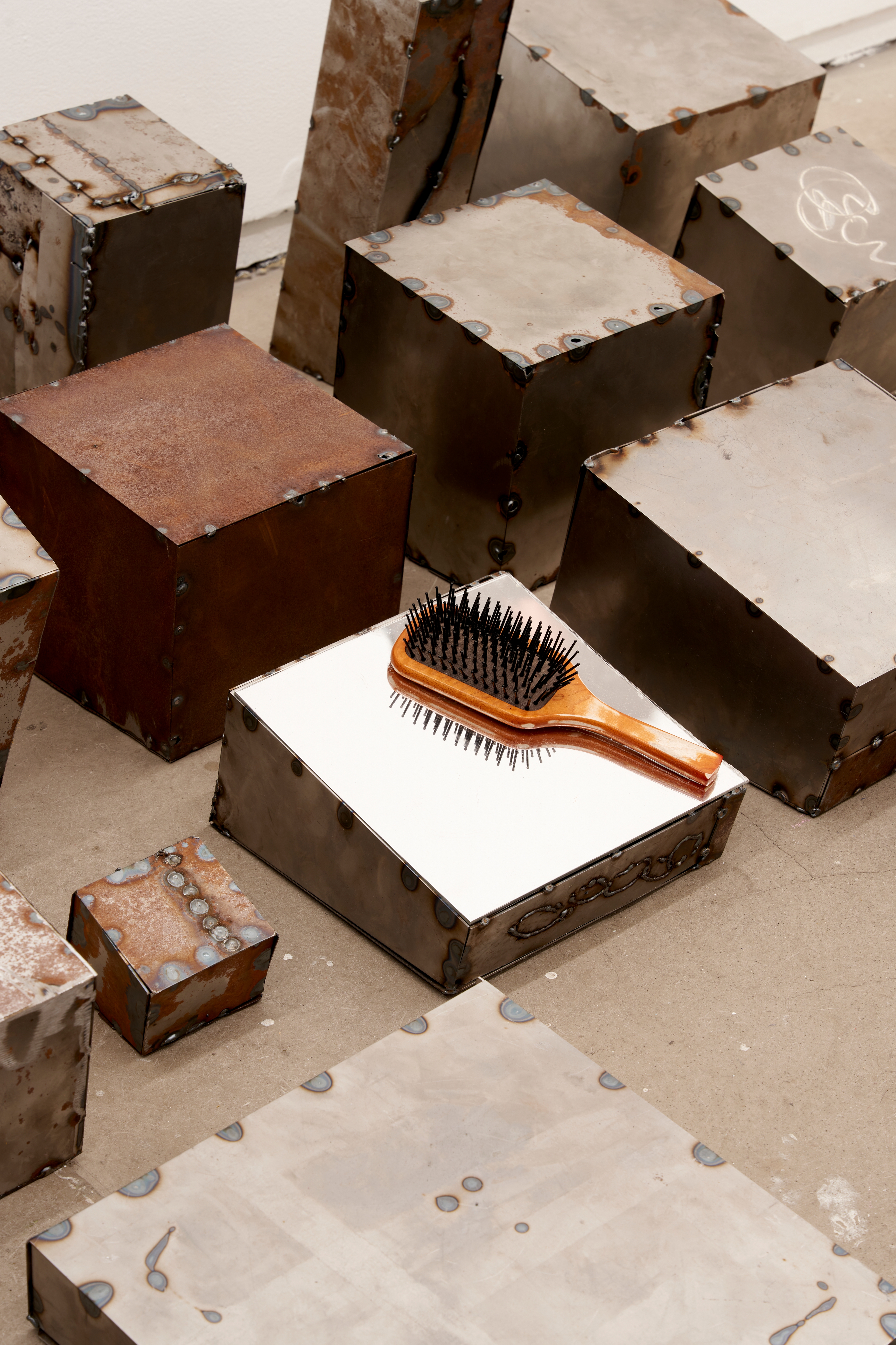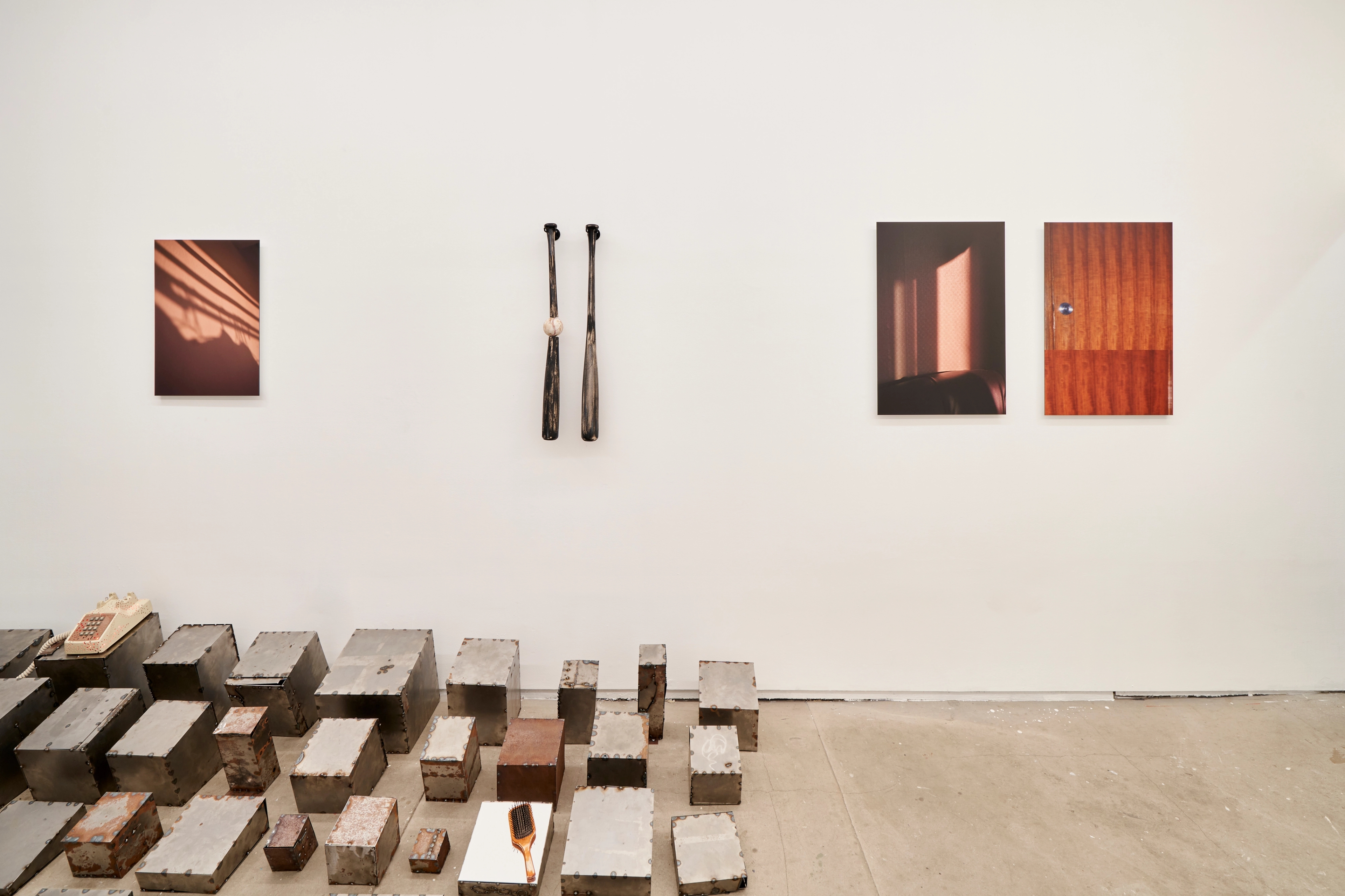 Tread Water is jiwoong's first solo exhibition with the gallery. Using photographic techniques, welded metal, and augmented ready-mades, the artist laces his uncle's lived experiences and observed behaviors with the items and architecture of the apartment where he, his uncle, his mother, and aunt lived in Seoul. The exhibition makes use of a photographic archive from the artist and his family. Two UV on durabond panels, Family, and Ripple, were taken by the artist on his last visit to Korea in 2021, which image splashes of light contouring the walls of their home. In the entirety of his family's photos, there is only one image of jiwoong's uncle: a picnic scene, which the artist has distorted and segmented into a grid of twelve panels in the wall work Squint. Though a pleasant moment, the scene was striking to jiwoong, how the splay of food, scattered shoes, reaching hands, and squinting eyes mimicked his uncle's accident. His composition is selective, illustrating how a traumatic change ripples through every part of a survivor's life, even the past. Water Vessels, varied metal boxes laid on the floor, reference the limp Joo walked with after his accident. One mirrored acrylic panel has a hair brush laid on it, acting as a displacement, a good memory hidden in plain sight.