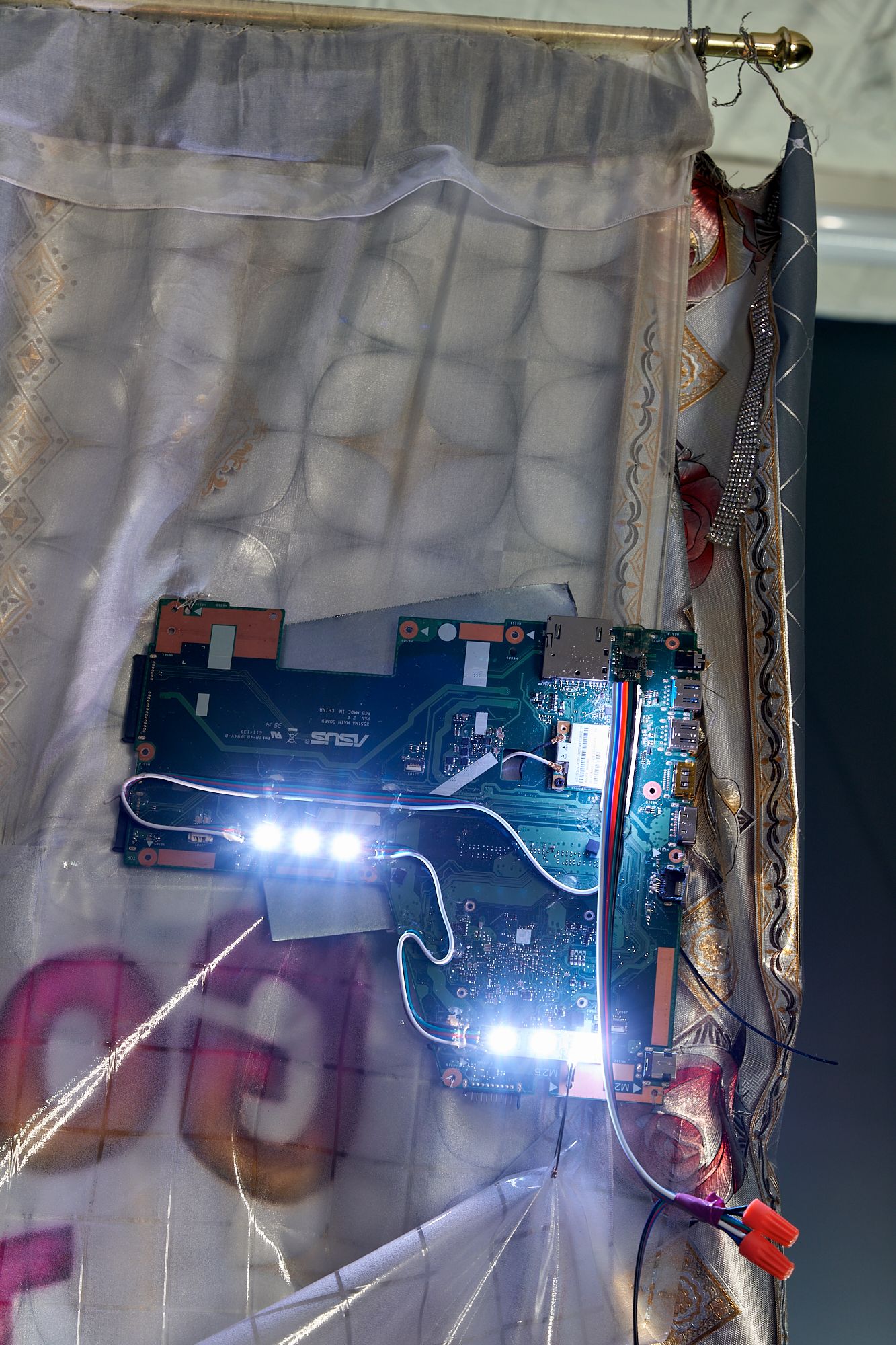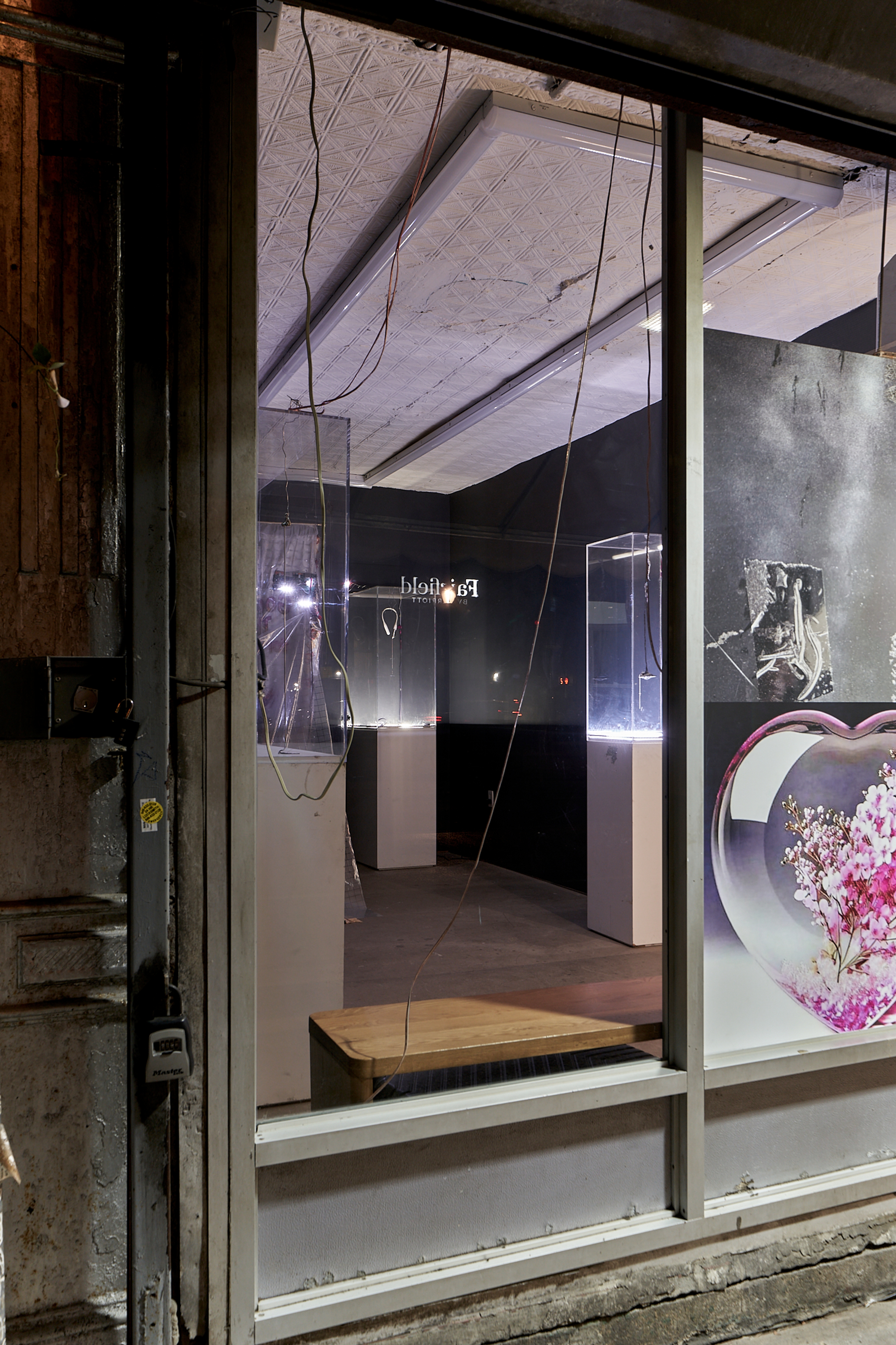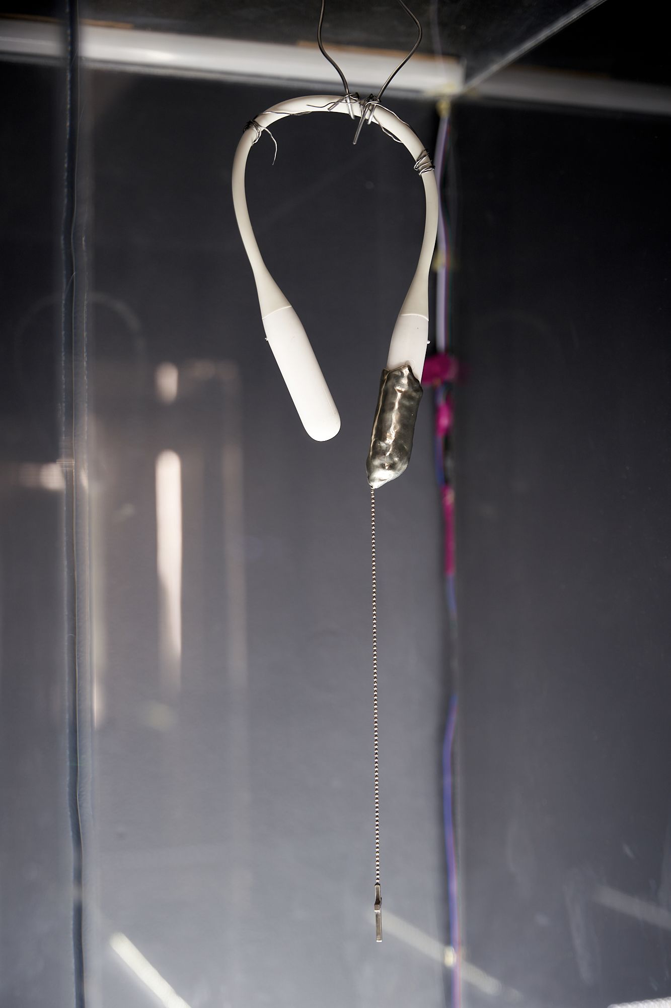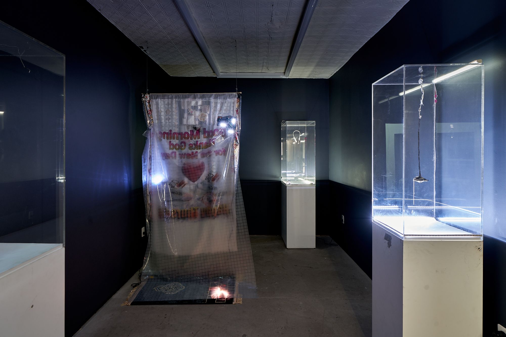 YATTA presents FATHAGOD.EXE. The installation proposes the unique treatment, use, and reliance on wearable technology by aunties and uncles along Fulton street. The artist observes this use of technology as evidence of continuous, spiritual, connectivity to the diaspora, honoring Blue Tooth wearables for their potential sacred use while acknowledging that this connection is wrought by extraction. This technology relies on raw materials pulled from the earth, often mined by the relatives of the very people who use it to stay in touch. YATTA observes and incorporates this distinctly colonial tension: extraction of Black material, both physical and cultural, appears to maintain and fuel the world as it exists now. By adorning ready made examples of tech wearables, crystallizing them as artifacts, YATTA heightens the spiritual role they play in daily life. Calling on an infinite past, FATHAGOD.EXE offers no solution, but information. Again, Connection.