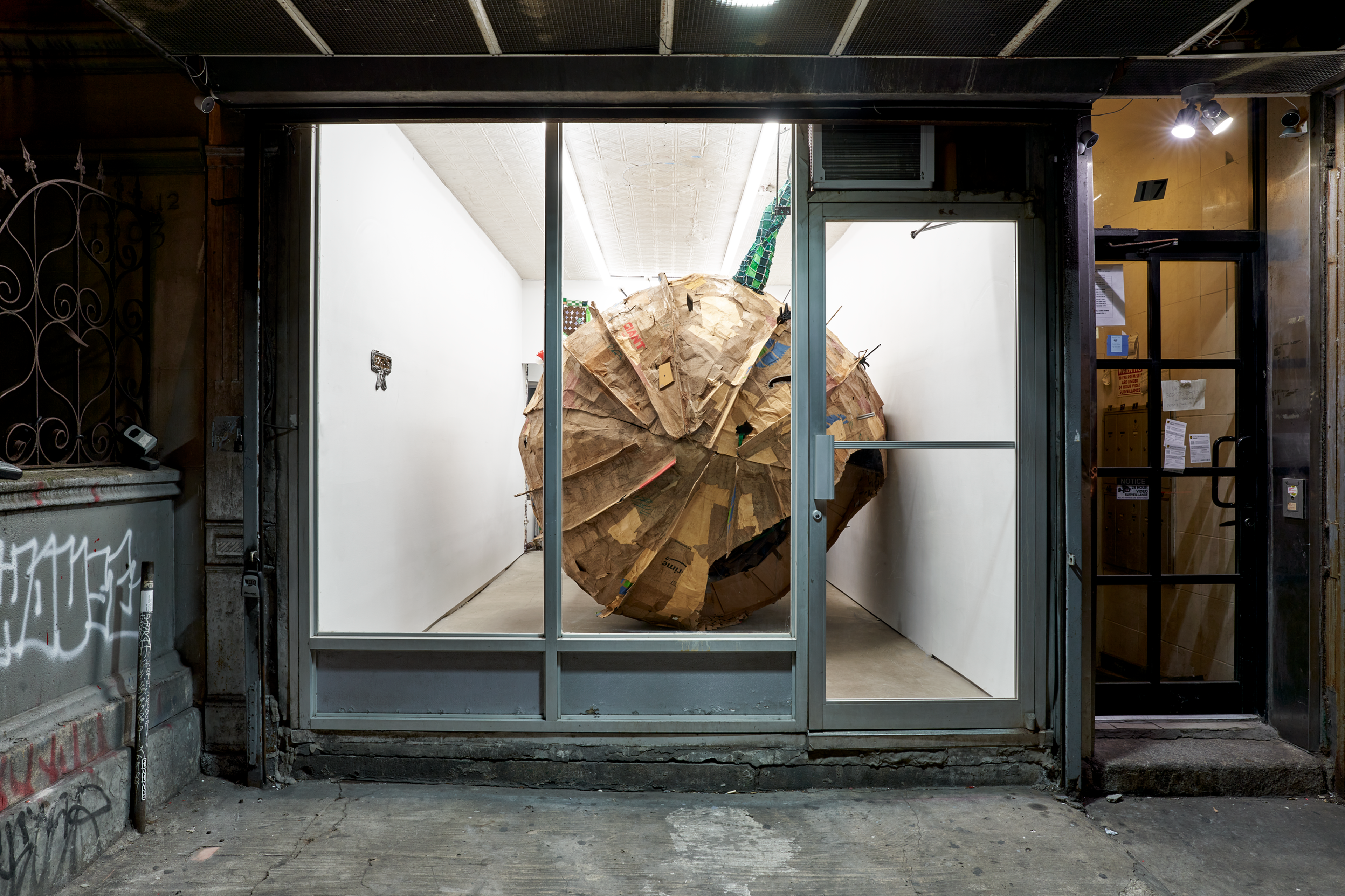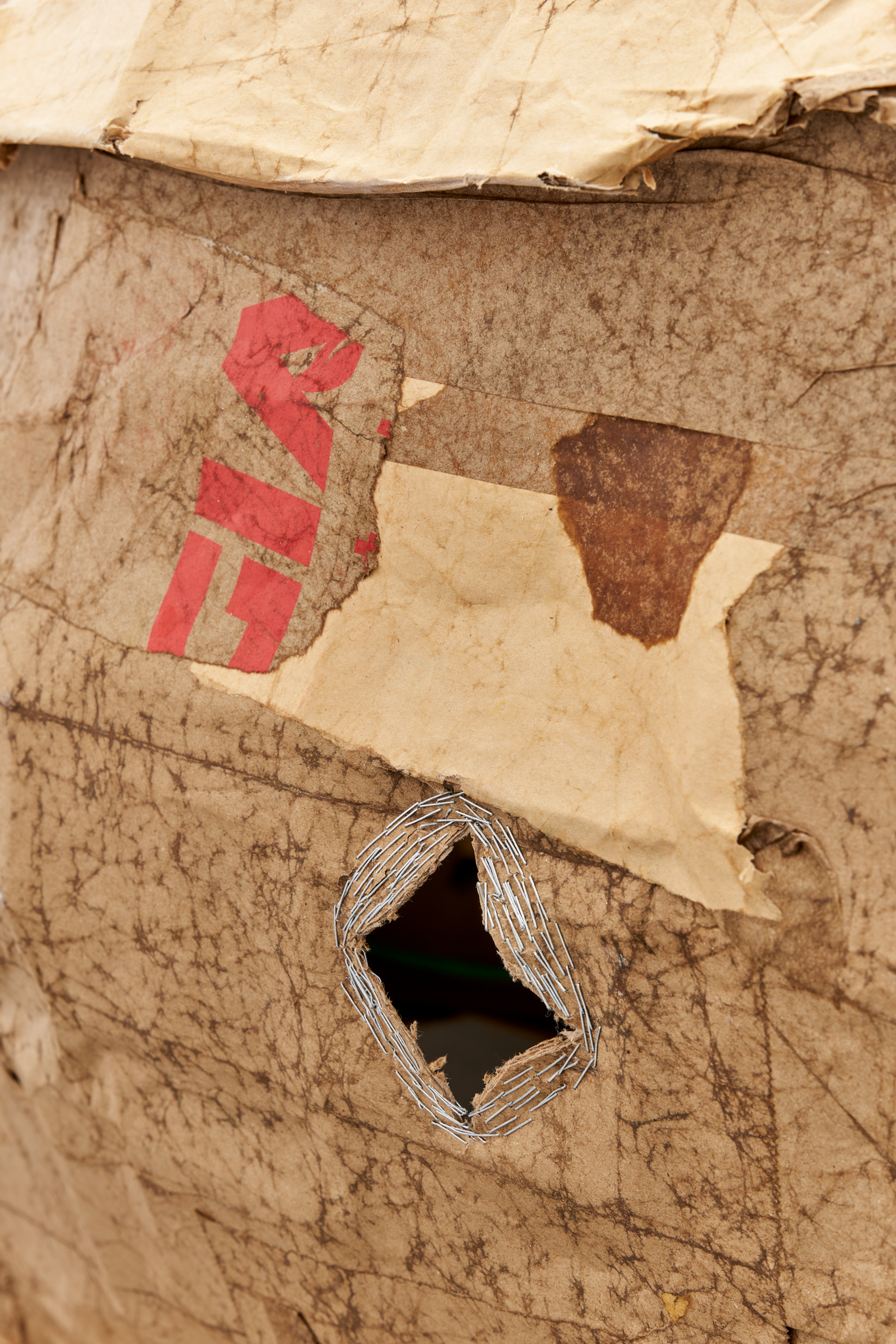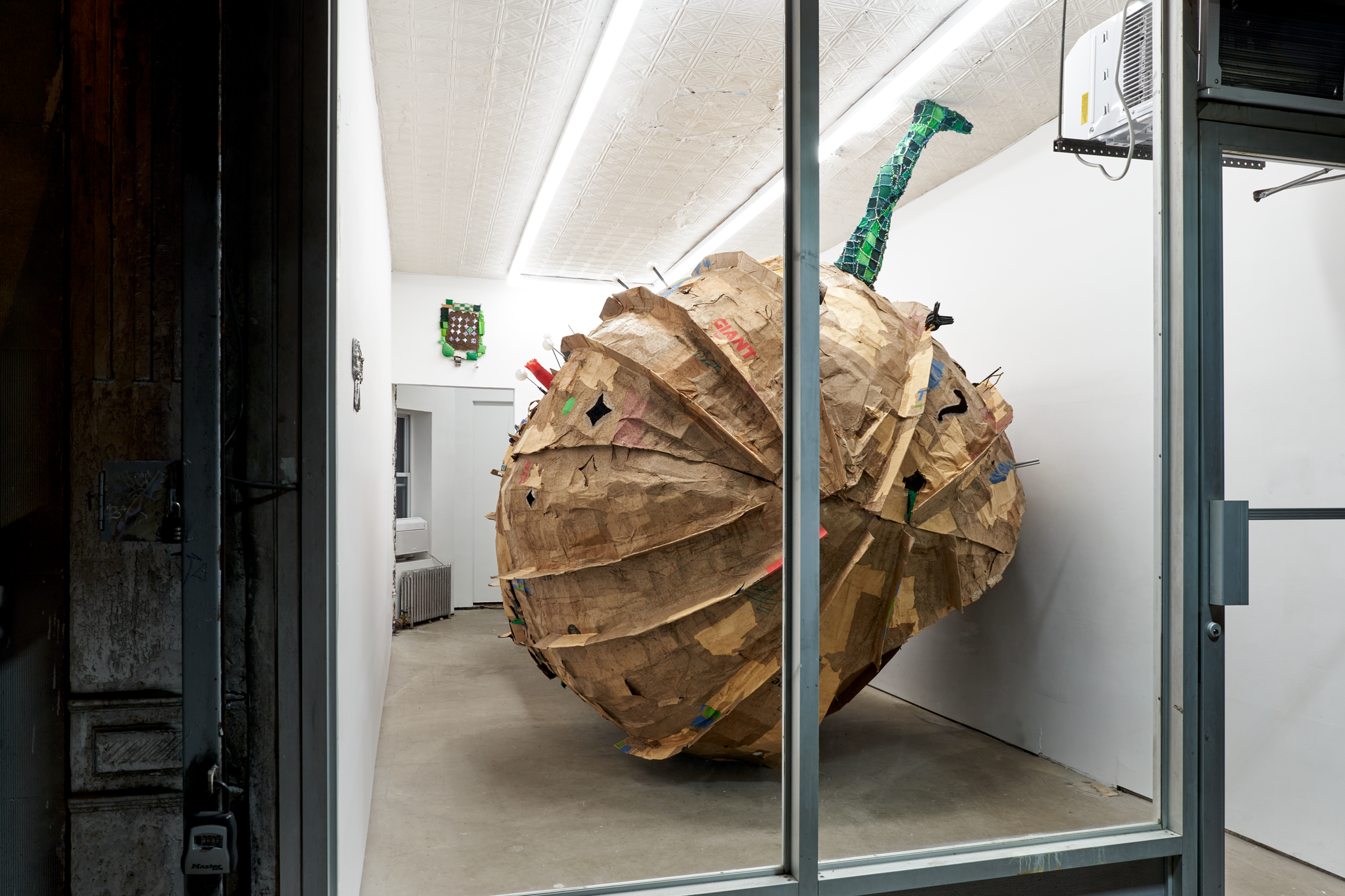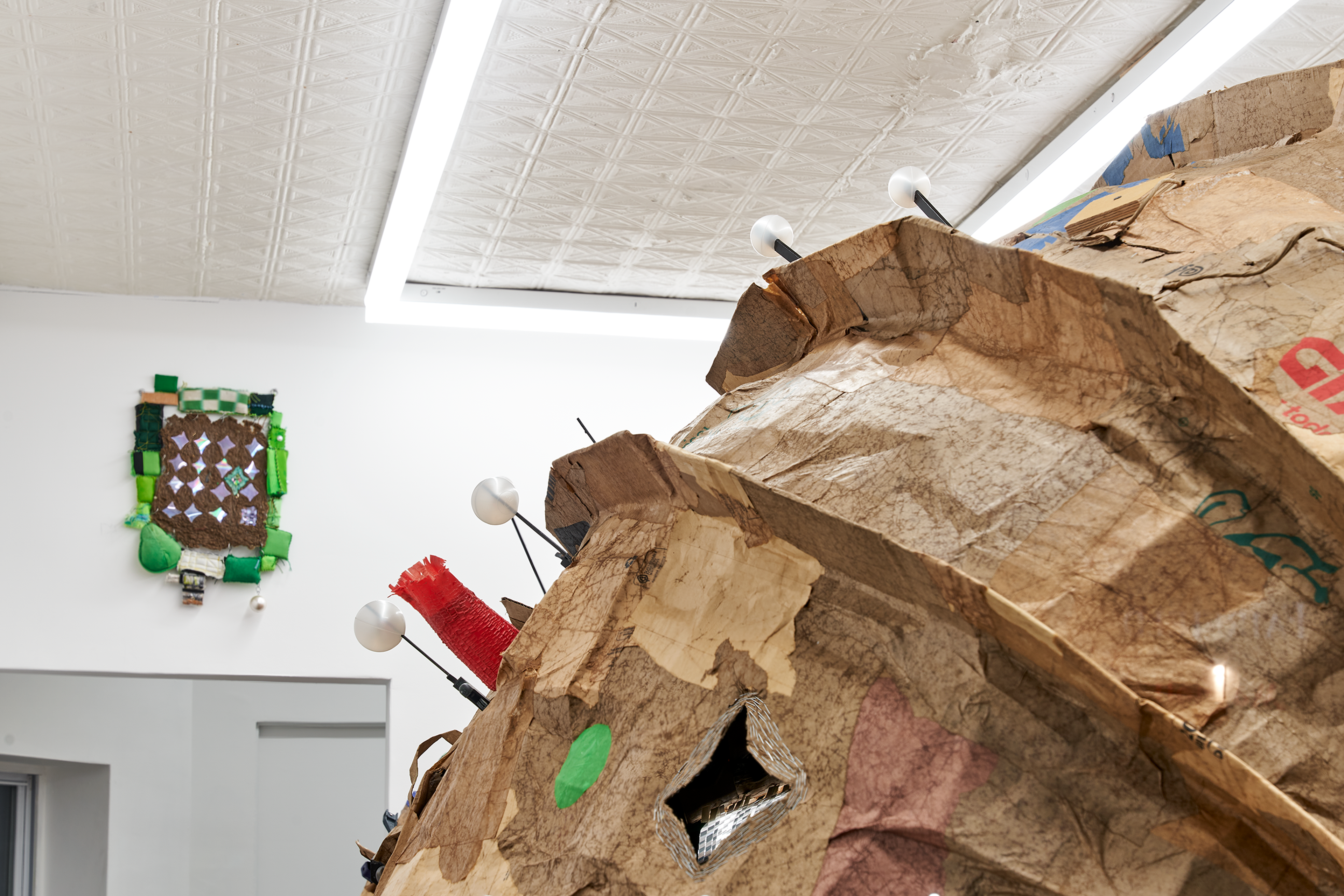 INANUTSHELL invites a deeper aesthetic inquiry into this conundrum: Struggling against the repression of dynamic cultural expression through rigid systems that prioritize fixed ideals over organic change. By extending and resonating with the visceral qualities of the créspissage ritual, the works on display explore the creation of idiosyncratic forms—not as a passive act of compliance, but as a living, evolving process. For their presentation at Blade Study, Senegalese-American artist Pap Souleye Fall offers a monumental peanut sculpture crafted from woven cardboard, spanning the exhibition space. This piece evokes the role of the Grande Mosquée de Djenné as a repository for written history. The sculpture contains a selection of books and handmade codexes by the artist, all of which can be accessed by crawling through an opening in the sculpture. In a further act of mimesis, the exterior of the peanut is covered in New York City road pulp—a naturally processed paper material created by the interaction of the city’s vitality with its weathered environment. The exhibition features smaller works, including ultra-processed studio materials and aluminum picture-planes mounted on the walls.