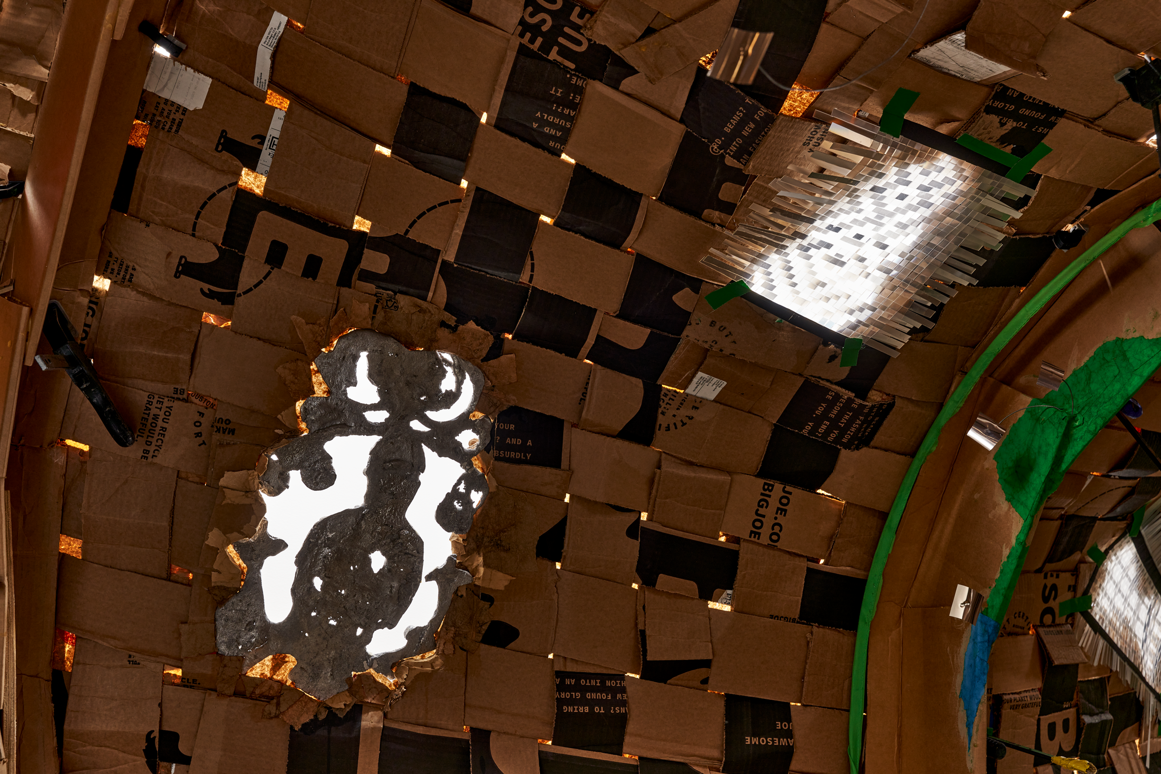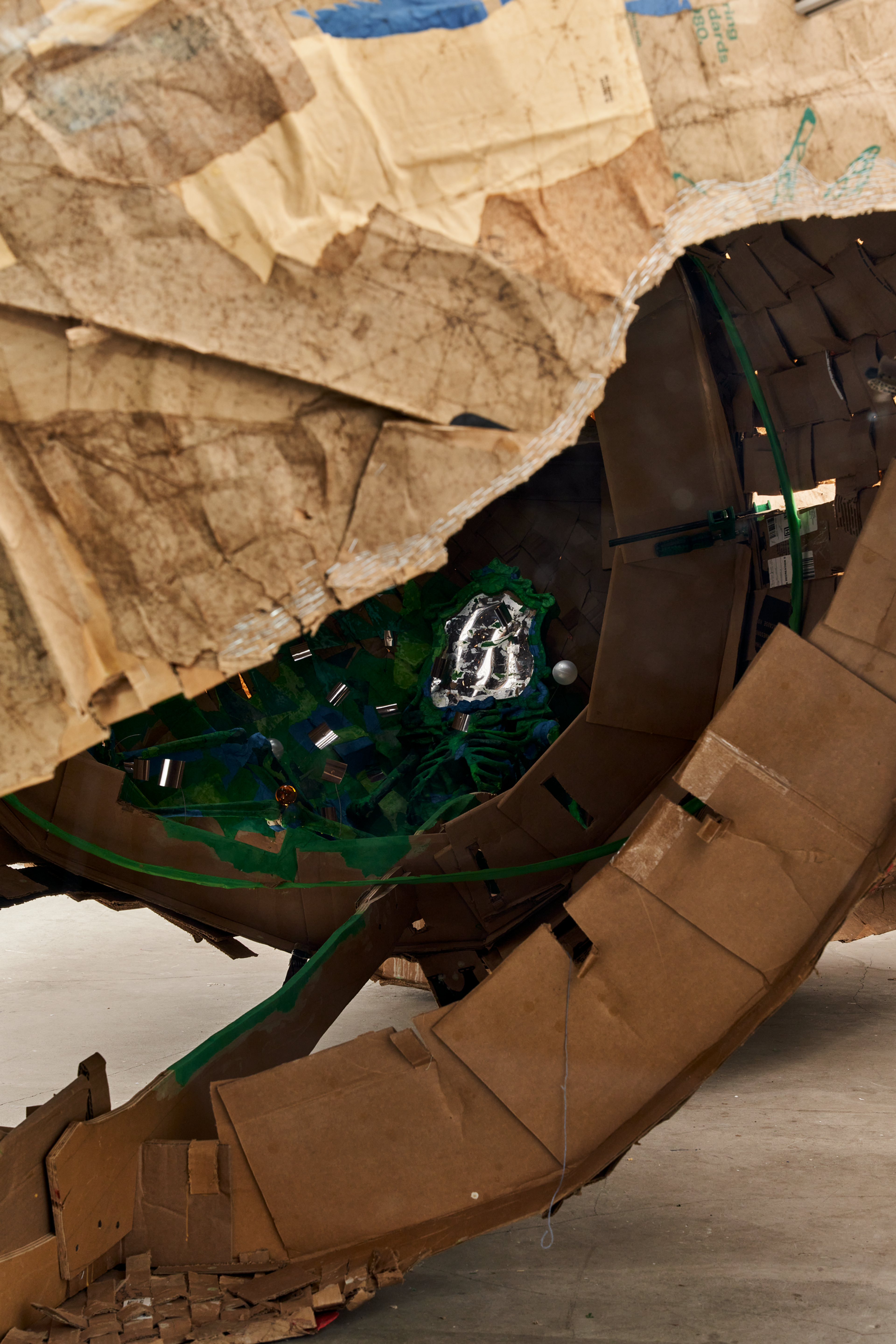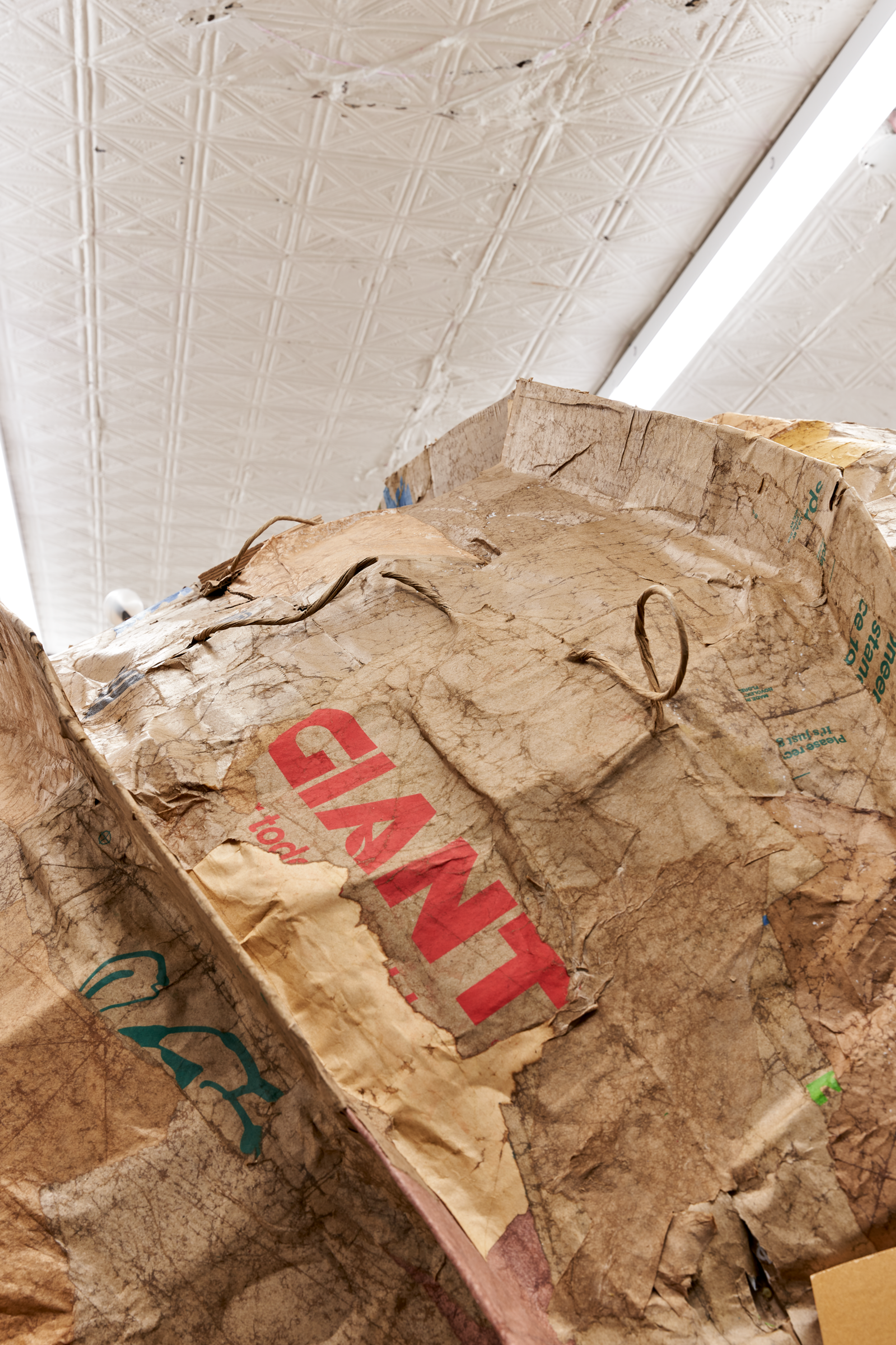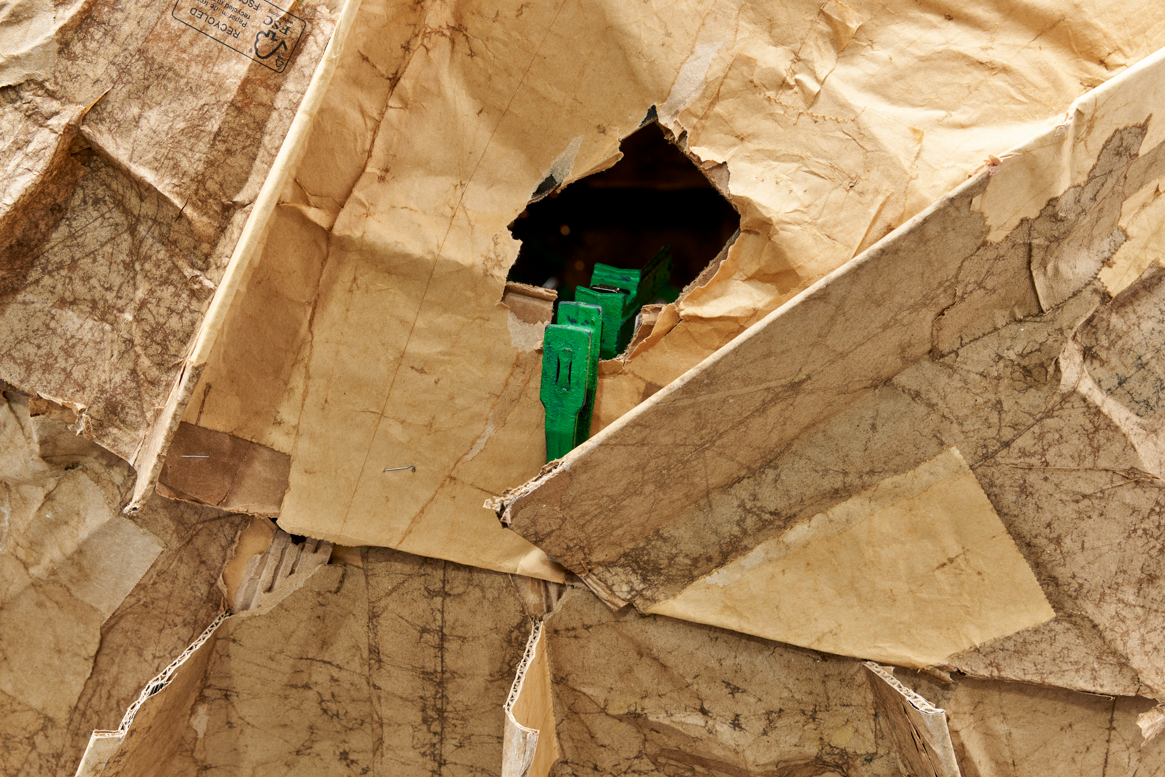 INANUTSHELL invites a deeper aesthetic inquiry into this conundrum: Struggling against the repression of dynamic cultural expression through rigid systems that prioritize fixed ideals over organic change. By extending and resonating with the visceral qualities of the créspissage ritual, the works on display explore the creation of idiosyncratic forms—not as a passive act of compliance, but as a living, evolving process. For their presentation at Blade Study, Senegalese-American artist Pap Souleye Fall offers a monumental peanut sculpture crafted from woven cardboard, spanning the exhibition space. This piece evokes the role of the Grande Mosquée de Djenné as a repository for written history. The sculpture contains a selection of books and handmade codexes by the artist, all of which can be accessed by crawling through an opening in the sculpture. In a further act of mimesis, the exterior of the peanut is covered in New York City road pulp—a naturally processed paper material created by the interaction of the city’s vitality with its weathered environment. The exhibition features smaller works, including ultra-processed studio materials and aluminum picture-planes mounted on the walls.