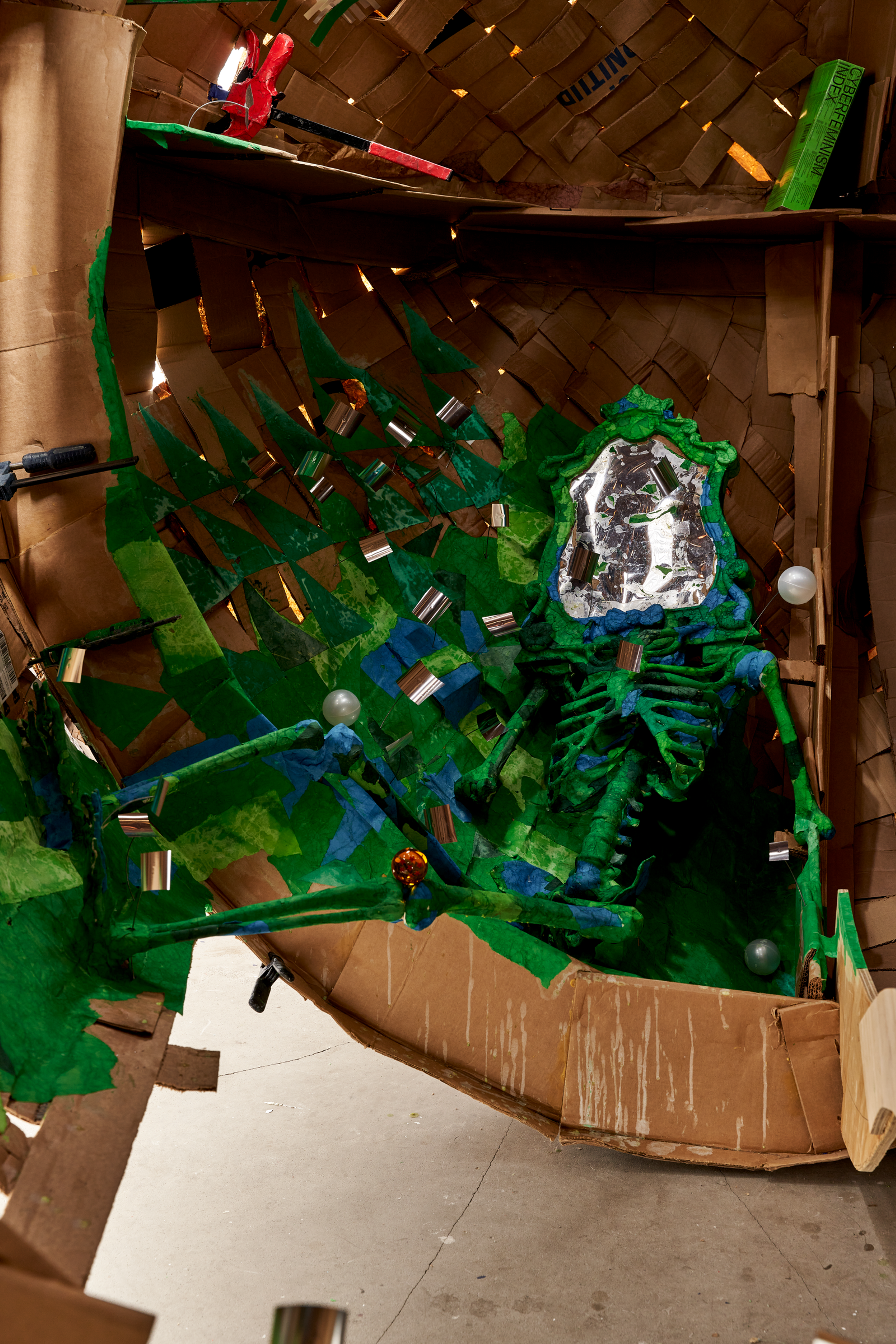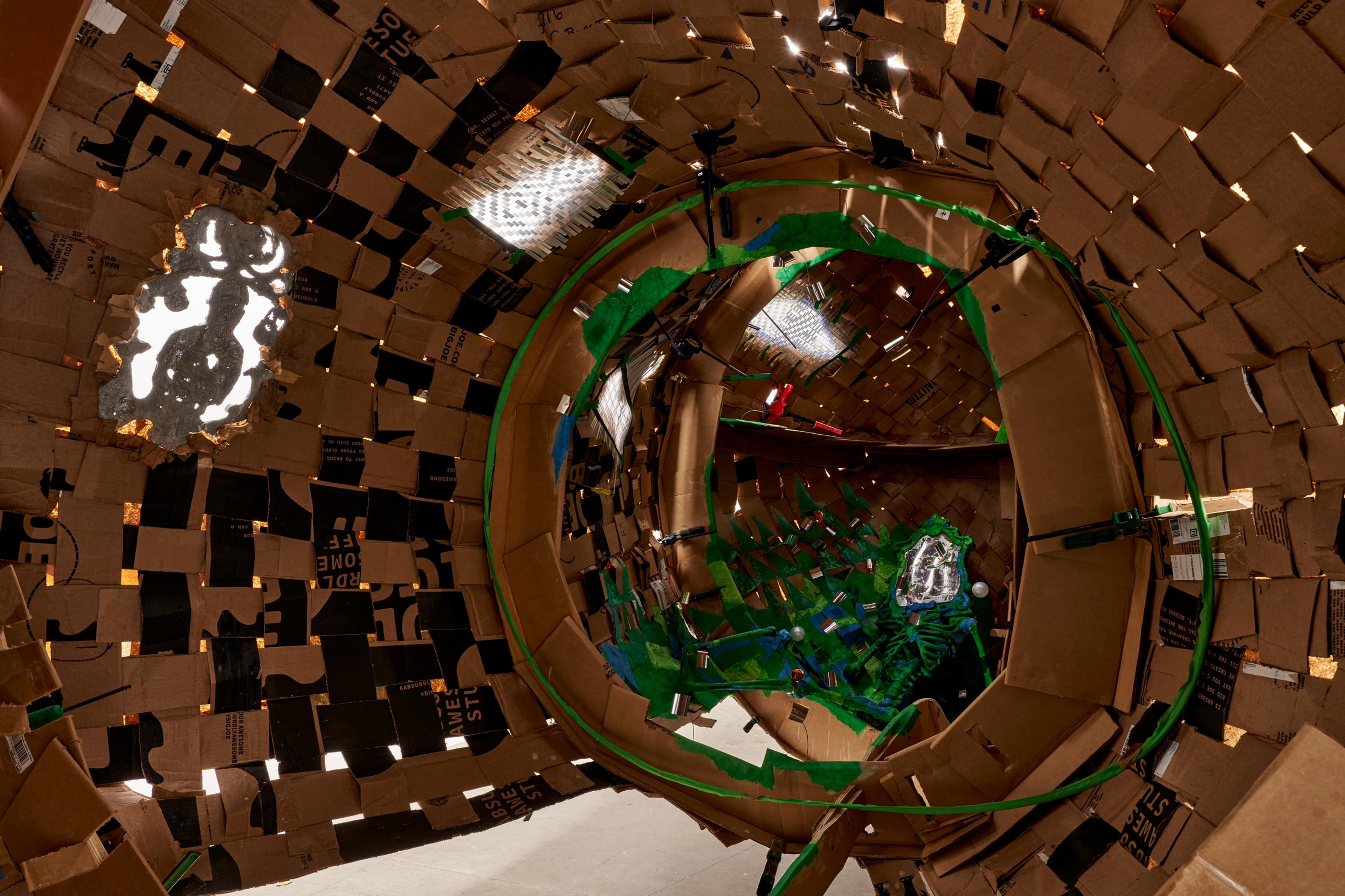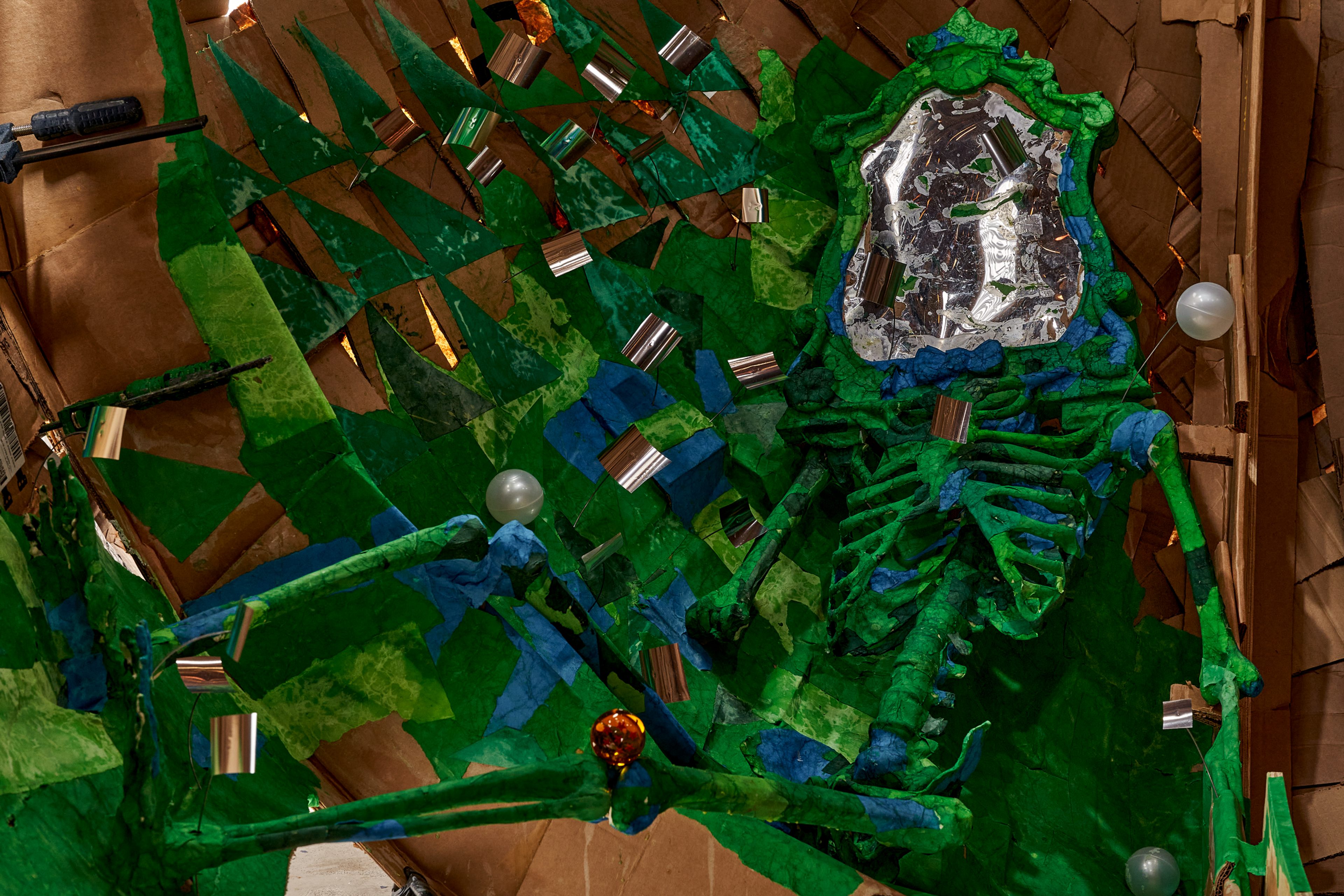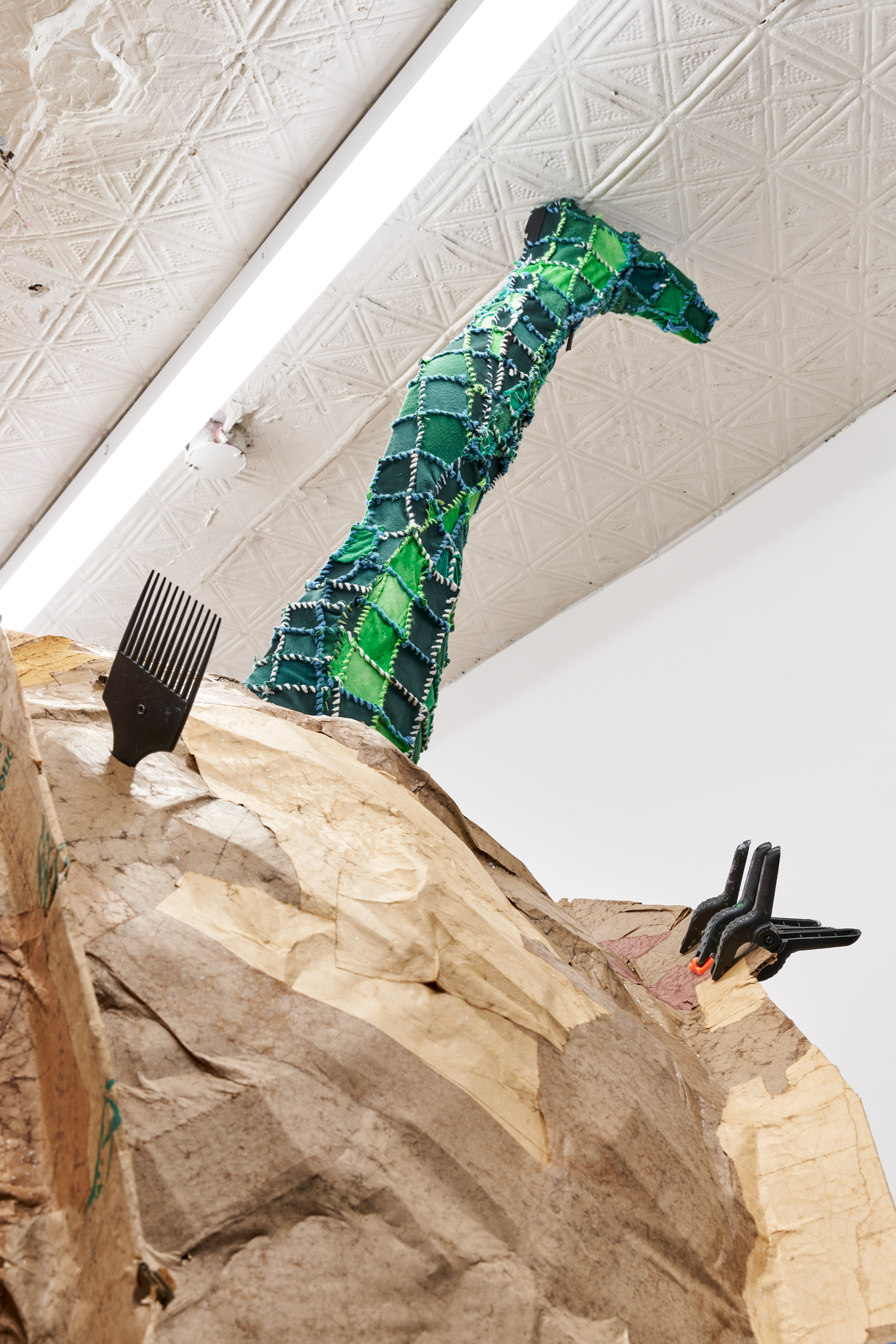 INANUTSHELL invites a deeper aesthetic inquiry into this conundrum: Struggling against the repression of dynamic cultural expression through rigid systems that prioritize fixed ideals over organic change. By extending and resonating with the visceral qualities of the créspissage ritual, the works on display explore the creation of idiosyncratic forms—not as a passive act of compliance, but as a living, evolving process. For their presentation at Blade Study, Senegalese-American artist Pap Souleye Fall offers a monumental peanut sculpture crafted from woven cardboard, spanning the exhibition space. This piece evokes the role of the Grande Mosquée de Djenné as a repository for written history. The sculpture contains a selection of books and handmade codexes by the artist, all of which can be accessed by crawling through an opening in the sculpture. In a further act of mimesis, the exterior of the peanut is covered in New York City road pulp—a naturally processed paper material created by the interaction of the city’s vitality with its weathered environment. The exhibition features smaller works, including ultra-processed studio materials and aluminum picture-planes mounted on the walls.