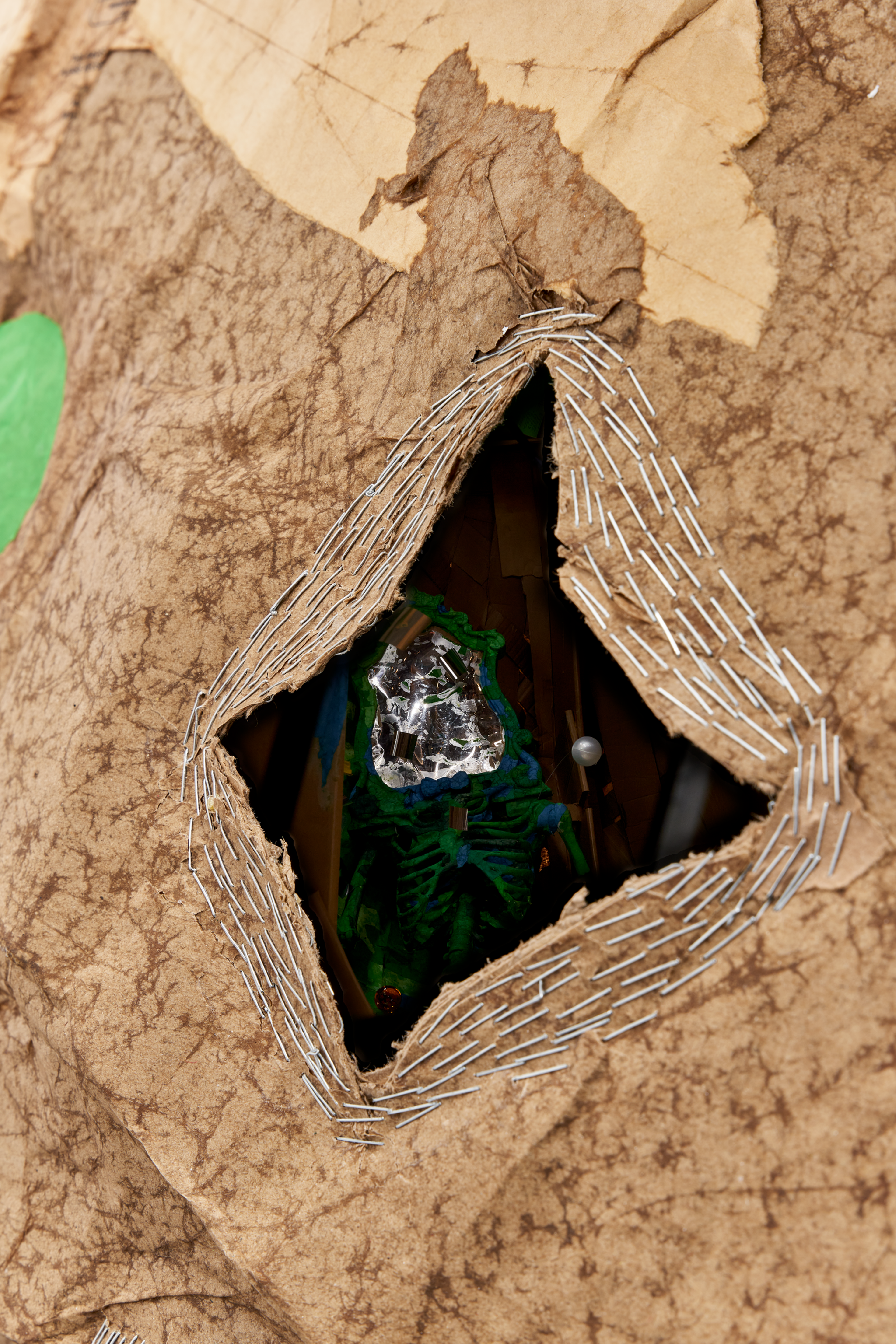 14" x 9"Cardboard Pulp, Thread, Fabric, Found Materials, Cast Peanuts, Beads