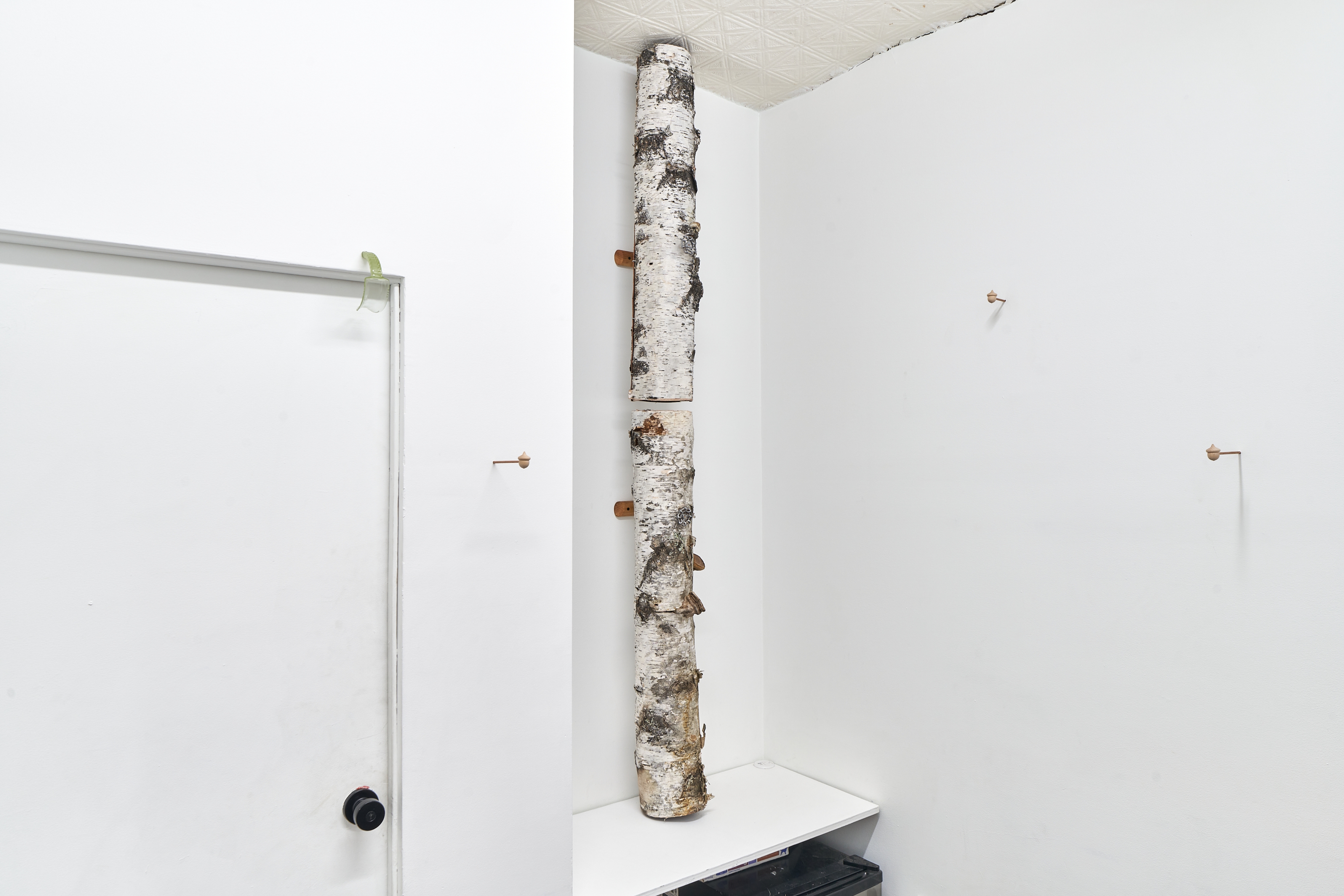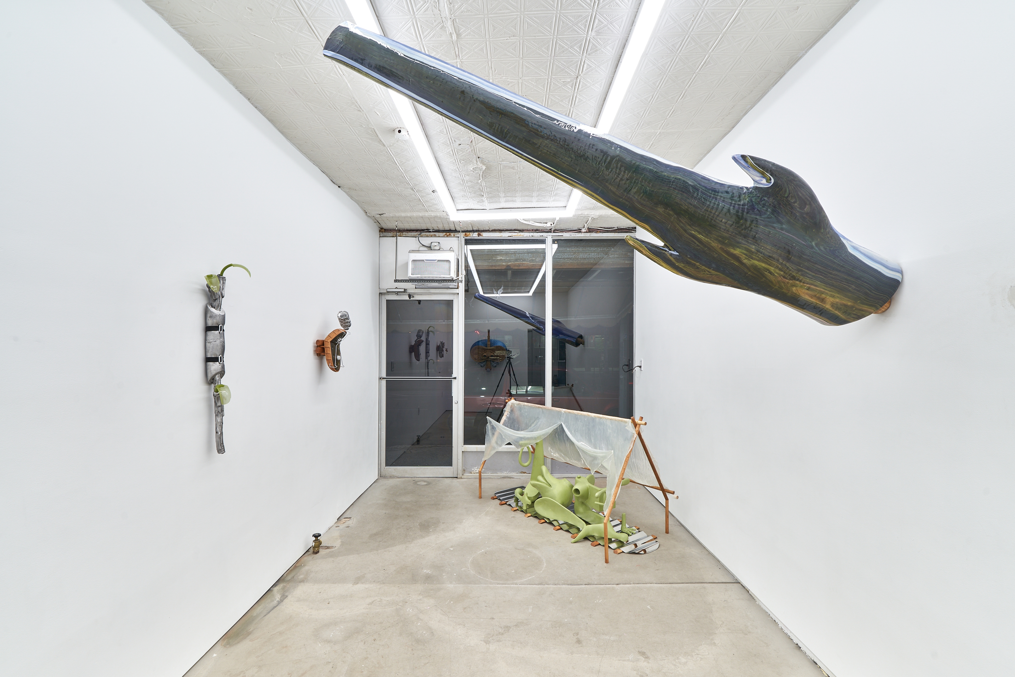 In his first exhibition with the gallery, Ryan Decker is taking a hike. A walk down a winding trail where he deploys the materials of camping to transmute experiences from an adolescence spent experimenting in the Blue Ridge Mountains of Appalachia. Decker has created sculptural work on the border of figuration that explore the function and convenience of modern tools with the inherent chaos of nature. Escalator to the Overlook describes seemingly incompatible methods of escapism by merging the refuge found in digital spaces with the experience of retreating to the great outdoors.