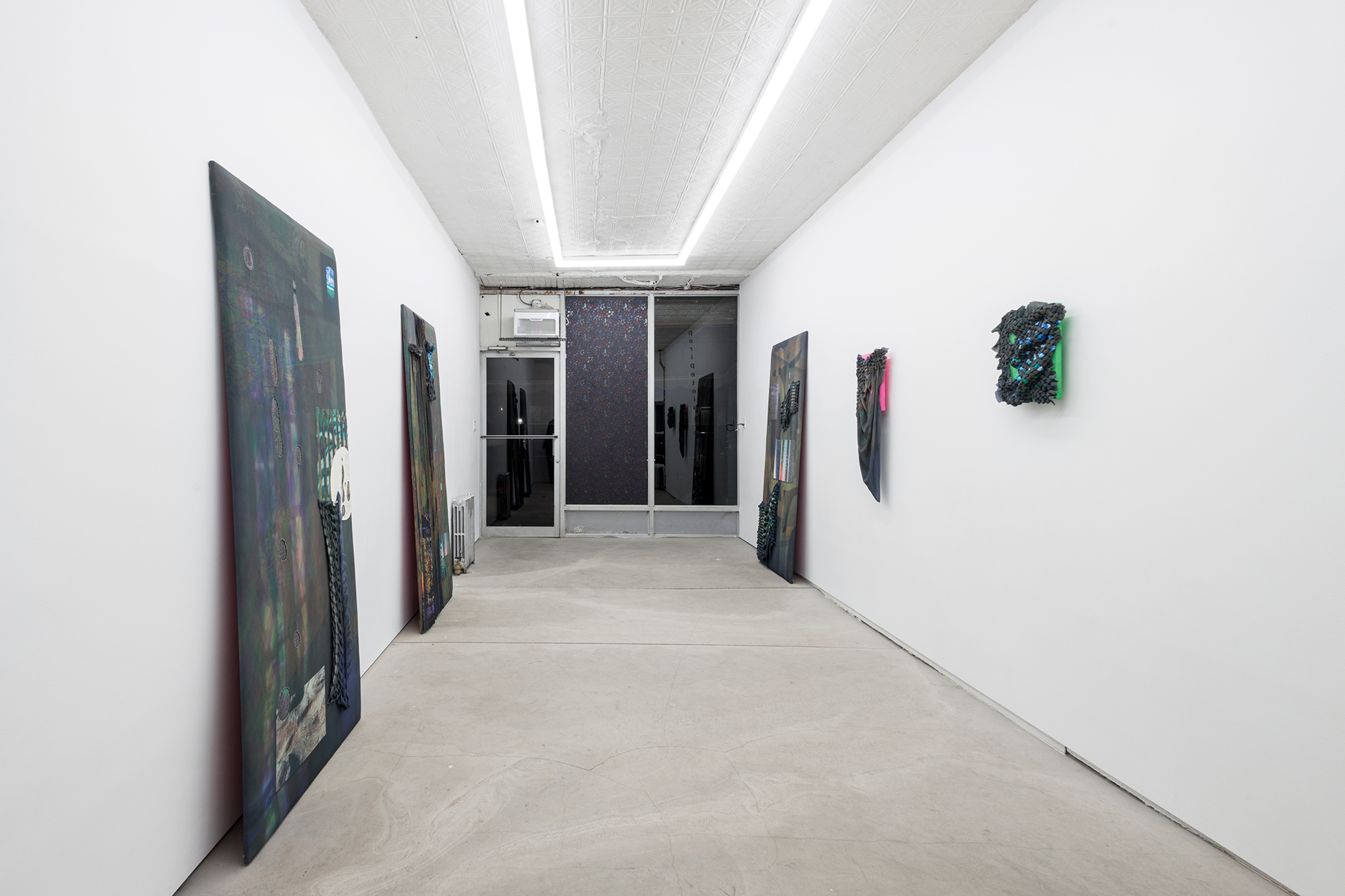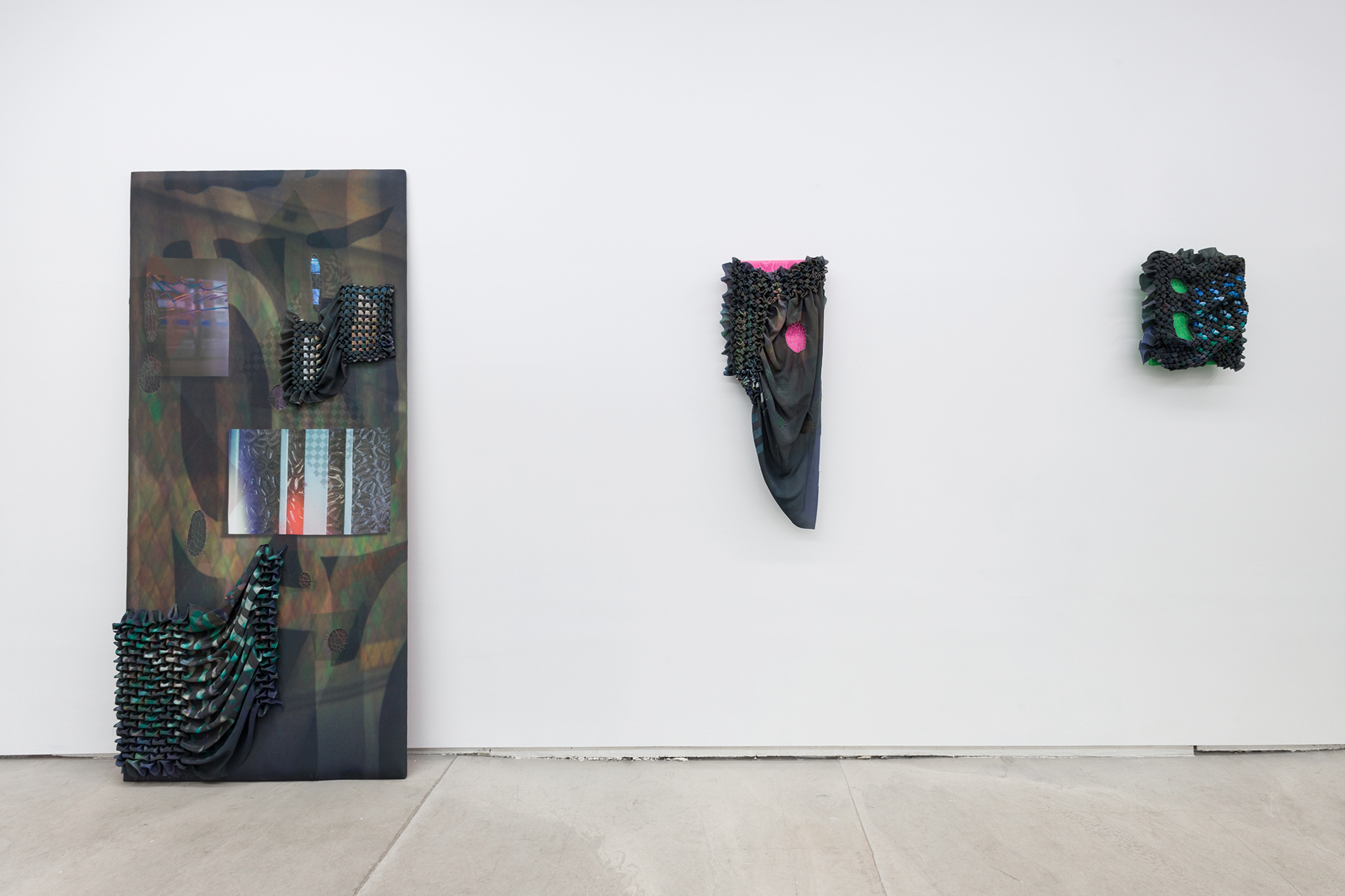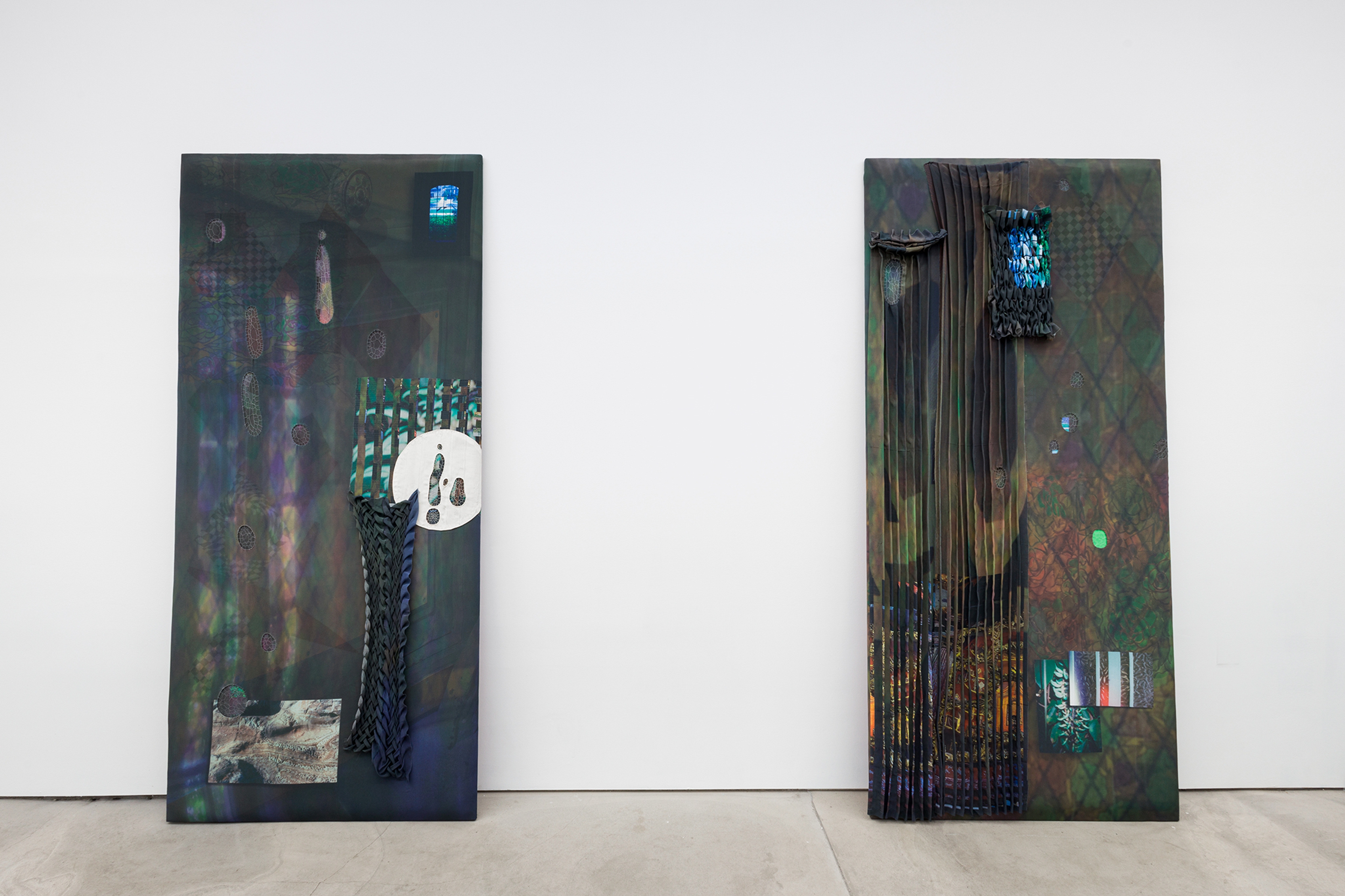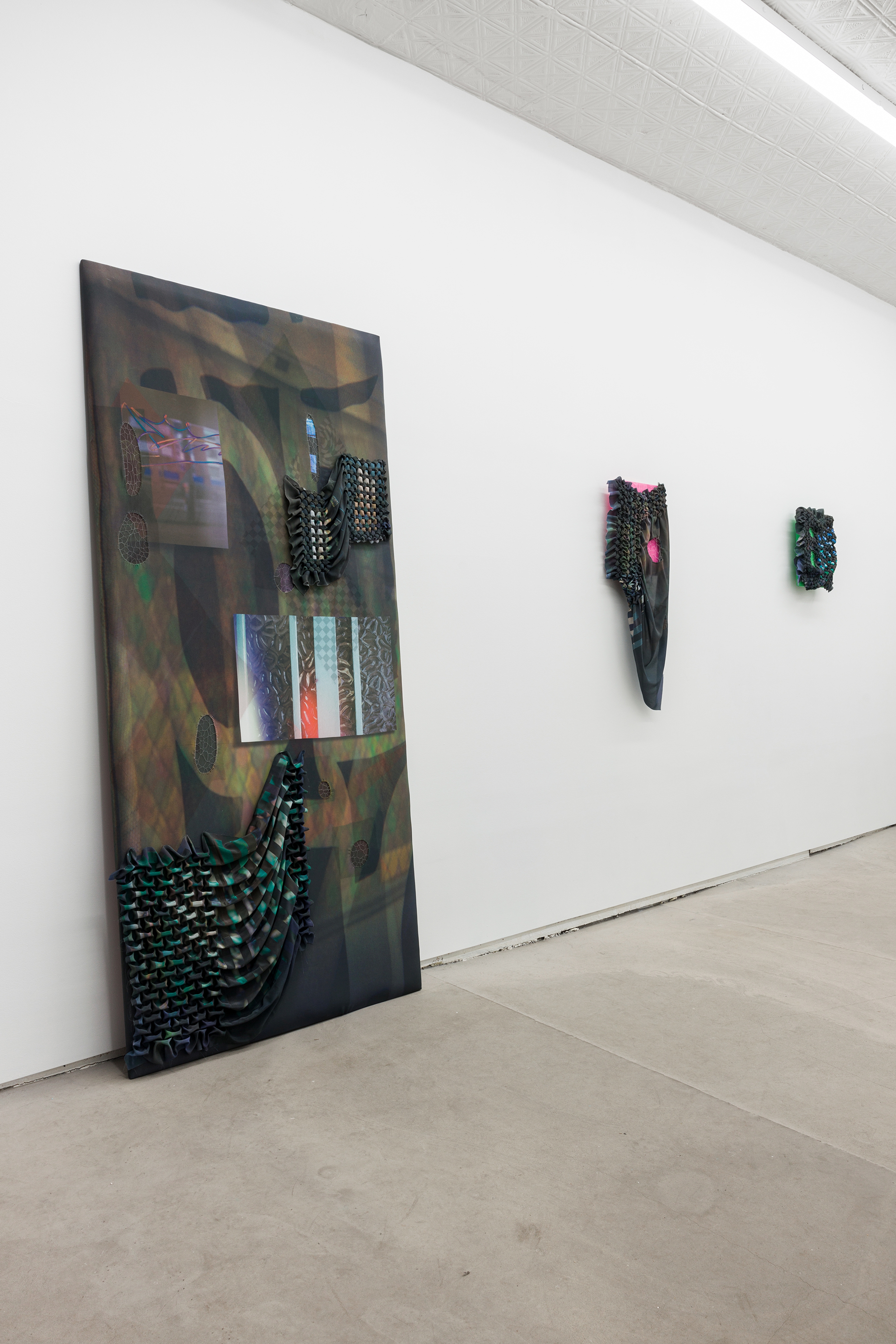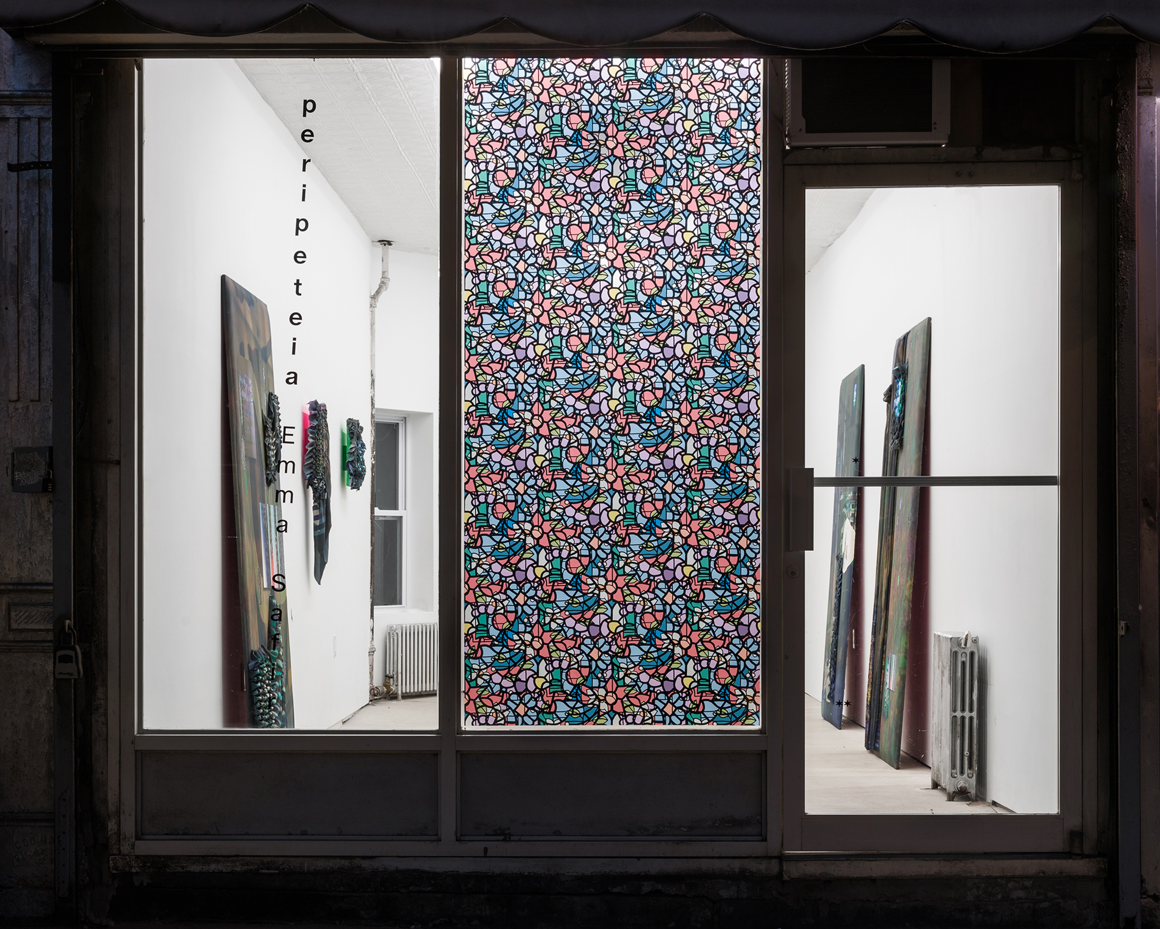 The show presents an entirely new body of work, including a triptych entitled modern prometheus I, II, III. These large scale panels are presented along two smaller works Hole Solution I, II. Together, these pieces demonstrate the artist’s continued exploration of vinyl stained glass privacy film used in domestic settings all over the world. “I’m trying to create images that contain several layers of reflection, specifically in glass that’s mediated via texture and pattern,” Safir says. These so-called “privacy solutions” form the basis of her window installation, which encompasses a single glass panel of Blade Study’s storefront, a reference to the imagery found across all five paintings.