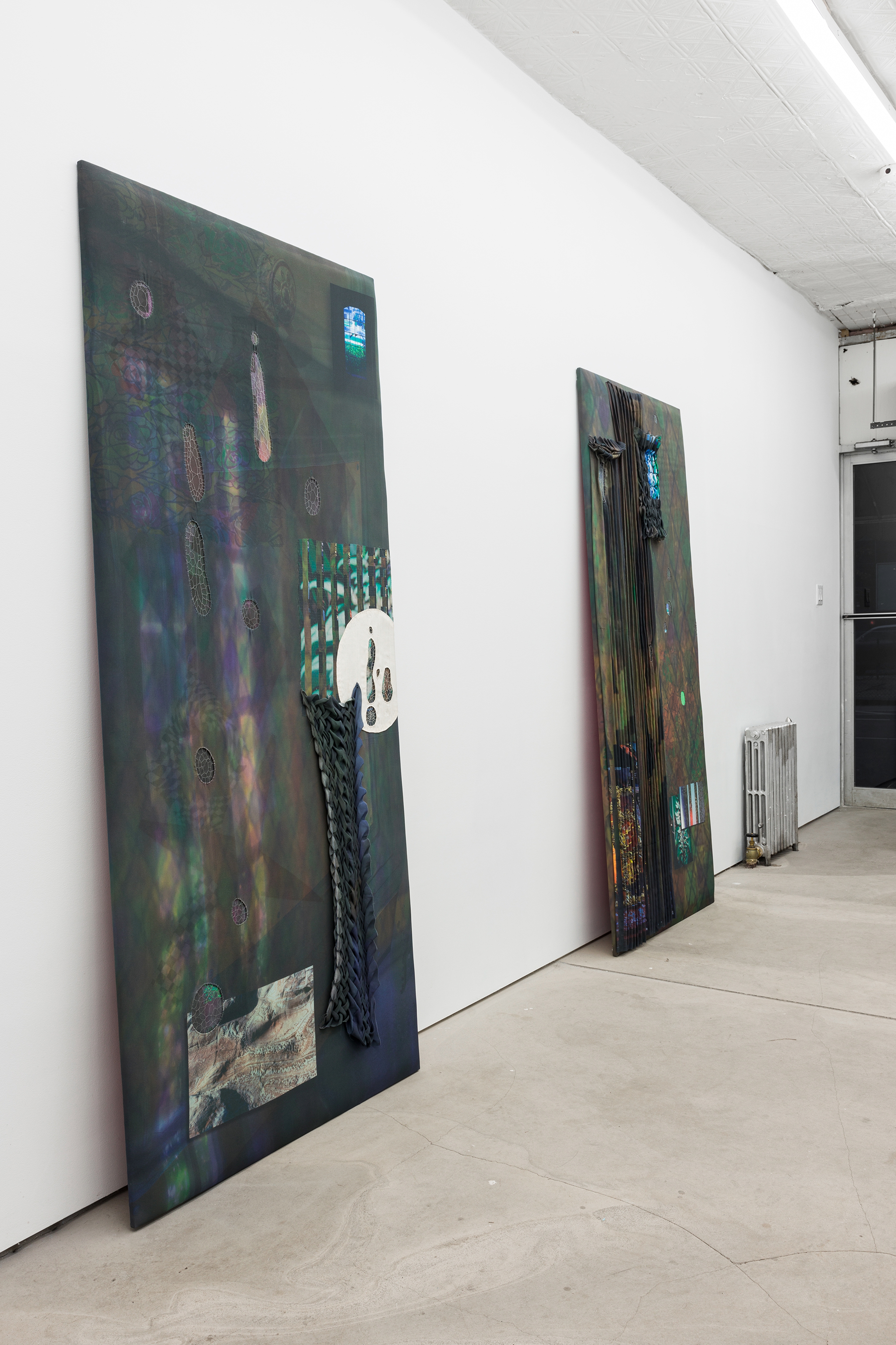 79" x 36" x ~1.5"Silk, mdf, neoprene, house paint, flashe paint, upholstery foam.