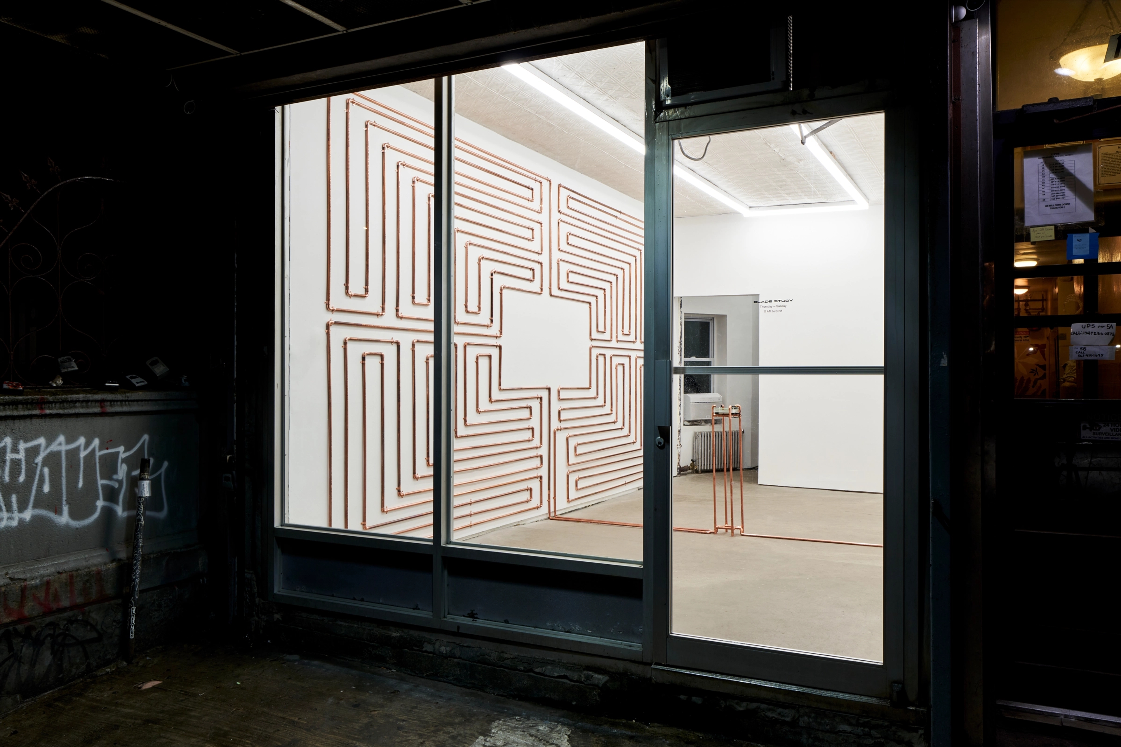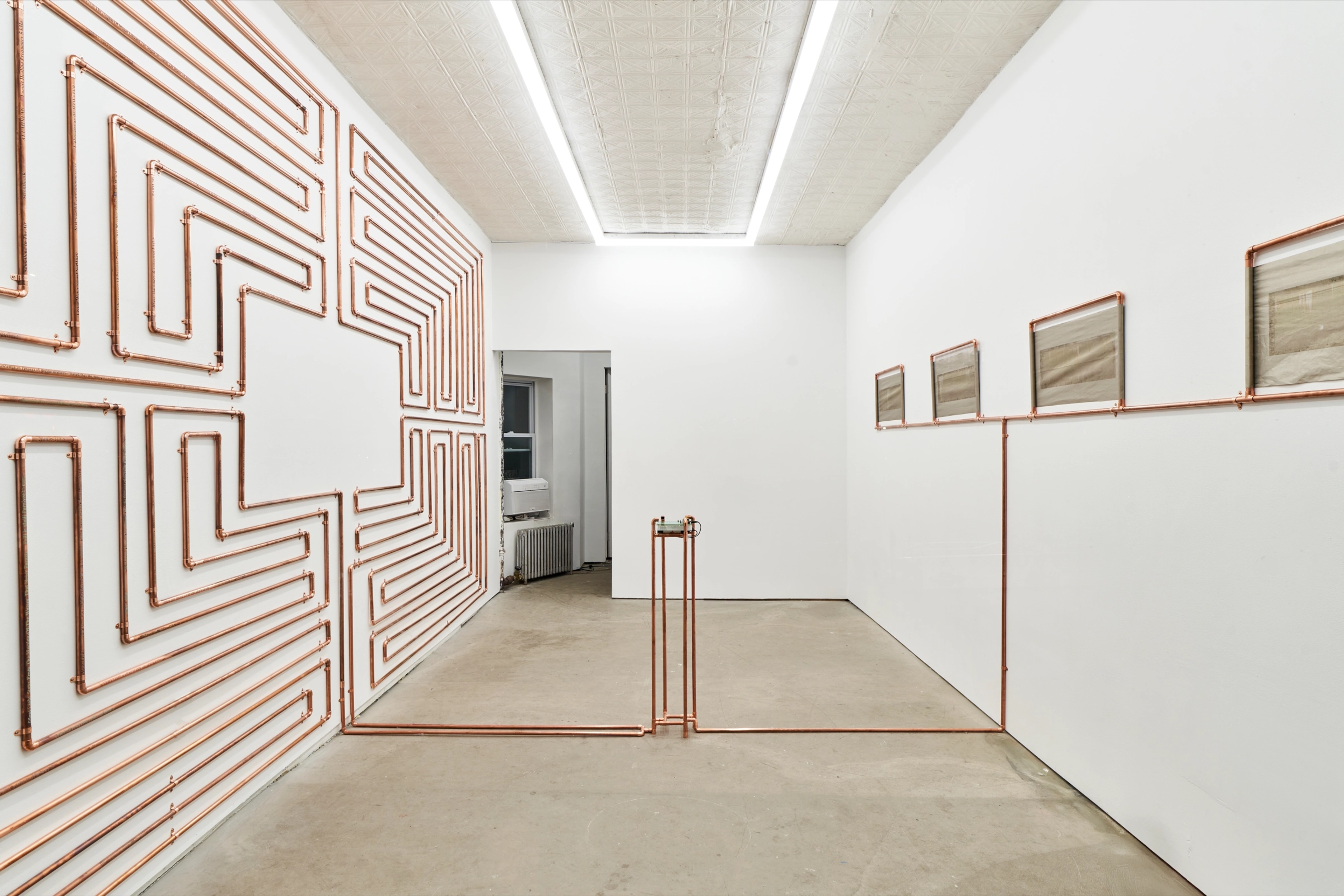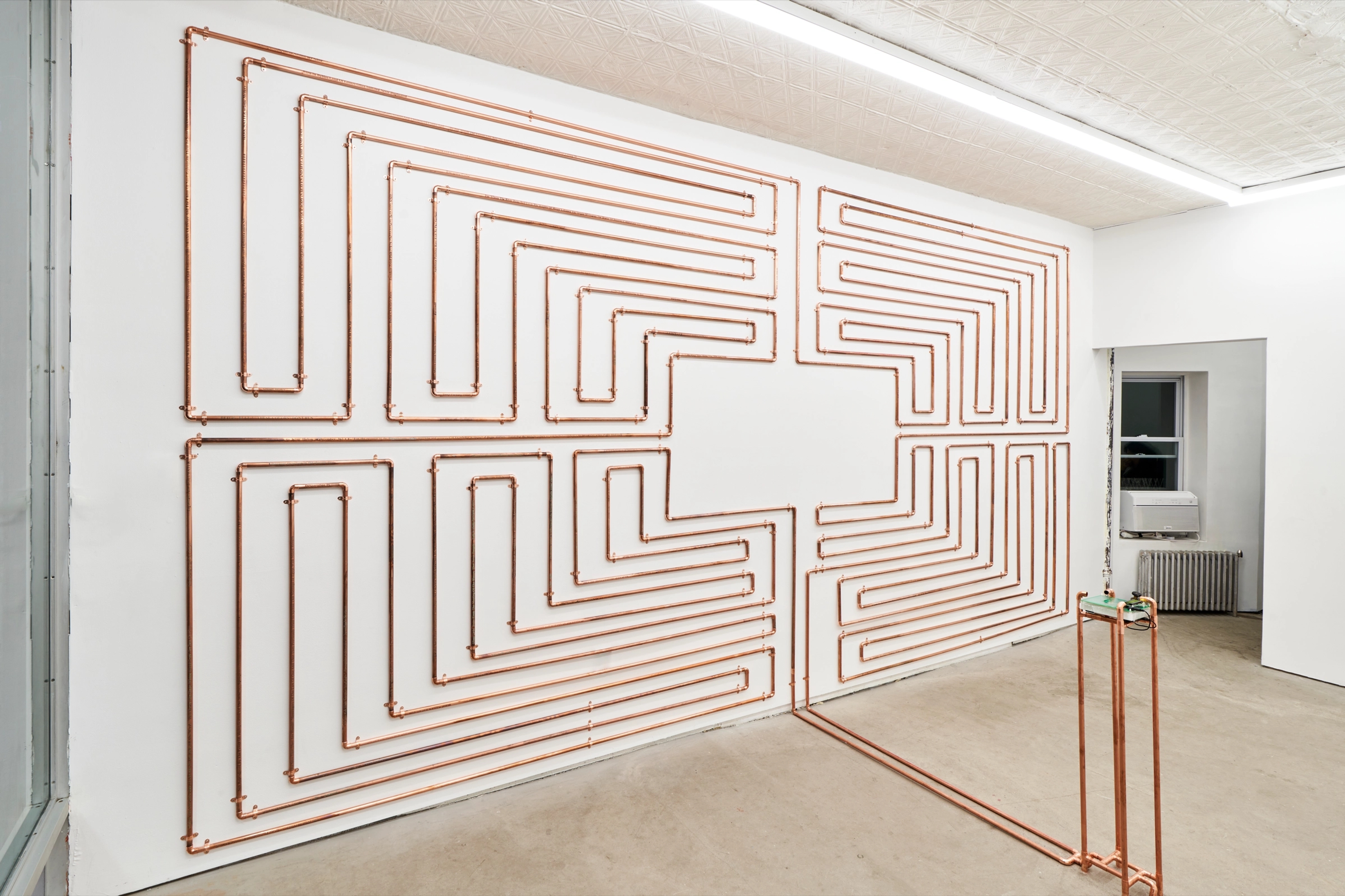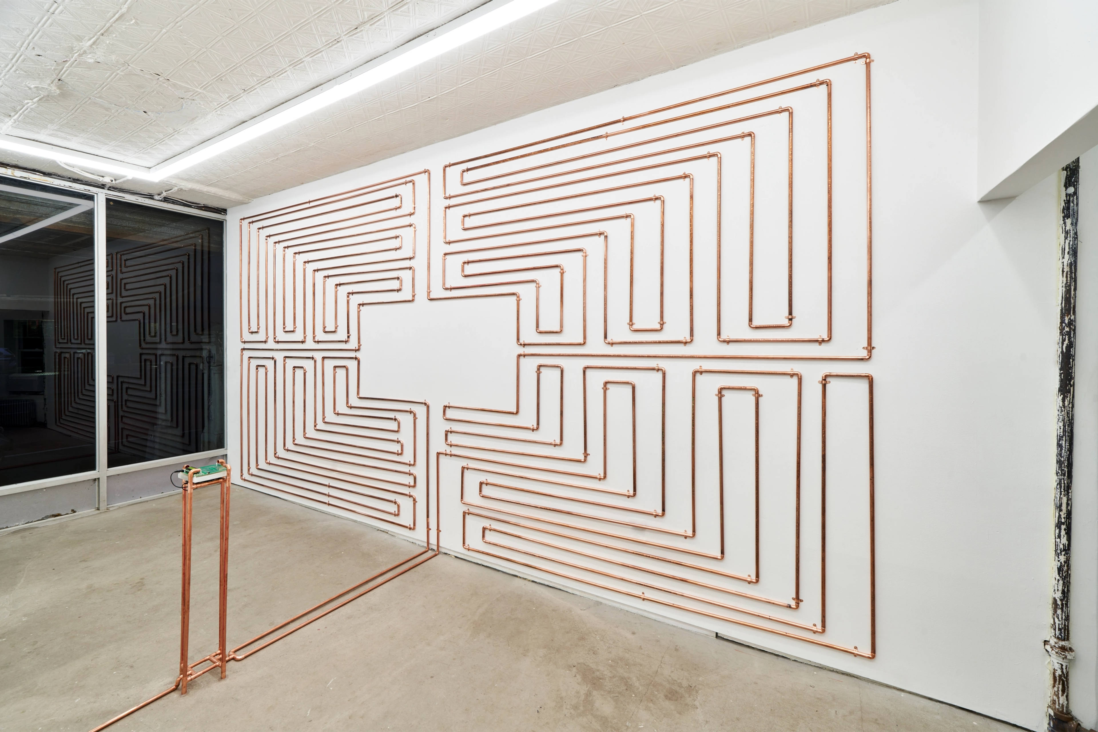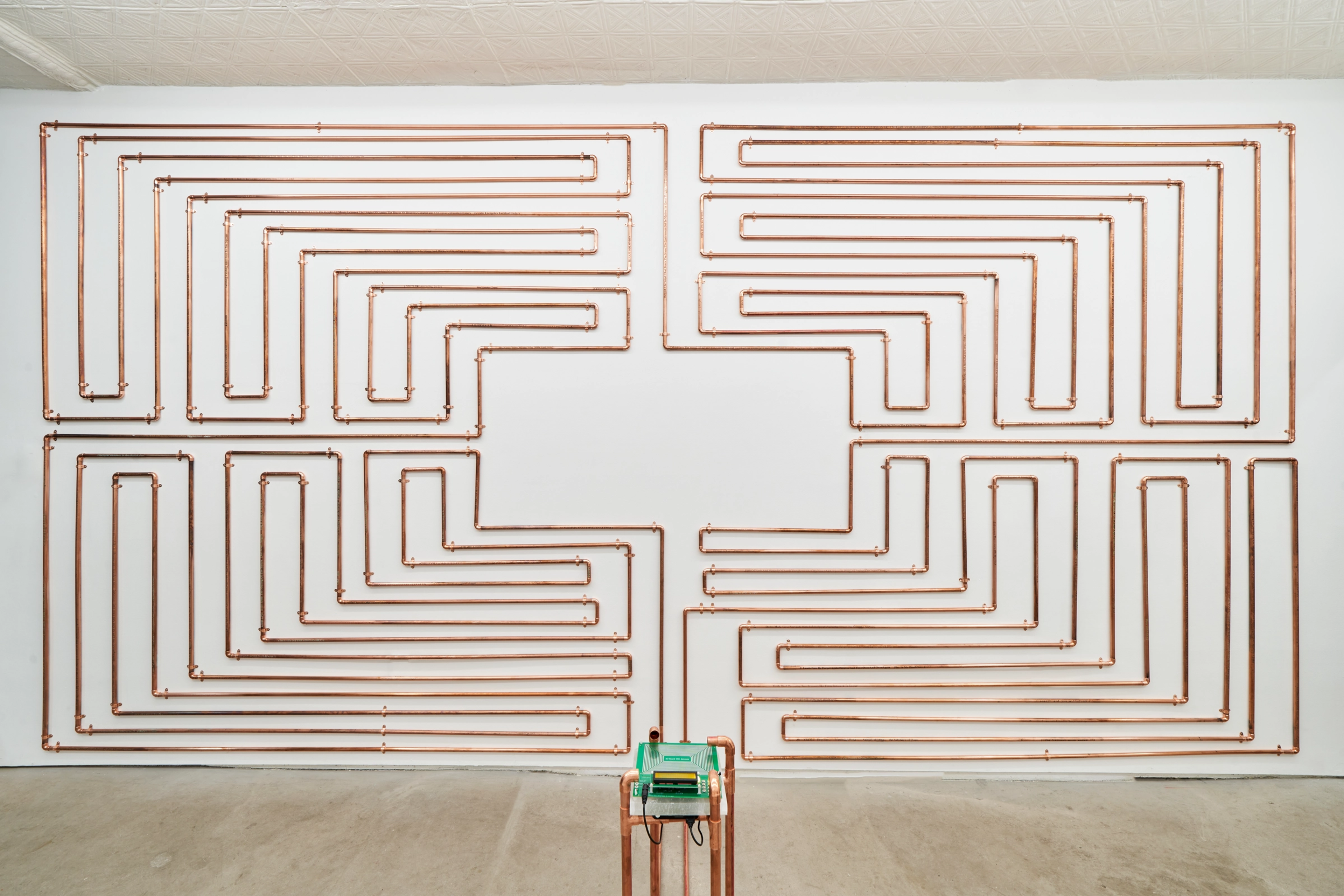 In Koury’s installation, copper pipes serve as natural conduits for this ultra-low resonance, channeling the frequency through an inherently conductive network inspired by both ancient pre-Christian labyrinths and modern hydronic radiant heating systems. Copper’s ability to transfer energy sustains the resonance as it moves through the labyrinthine form, fostering a dynamic interaction between the physical and energetic realms within the space.