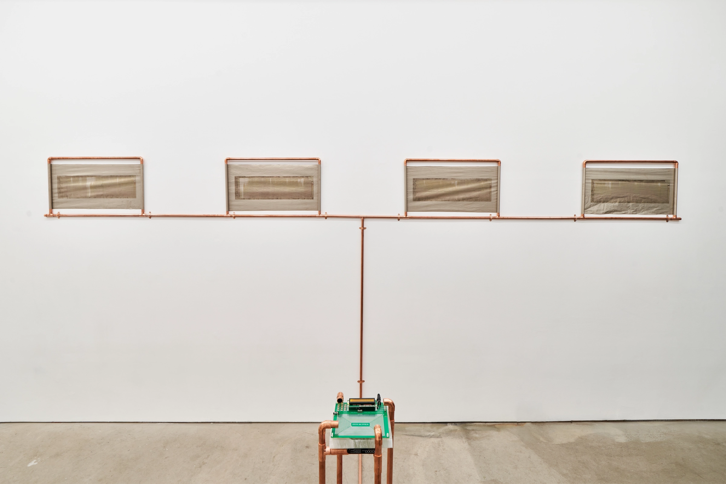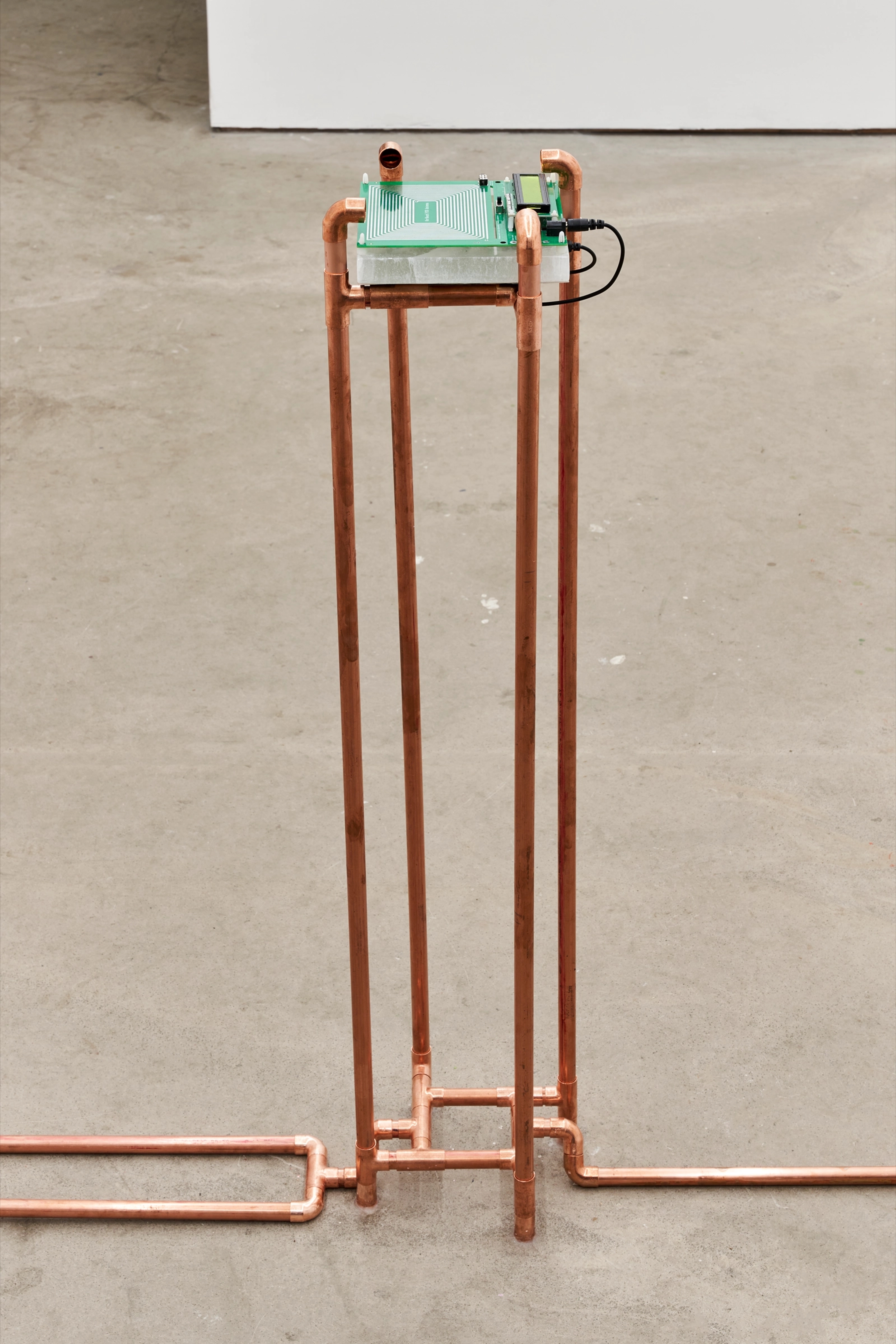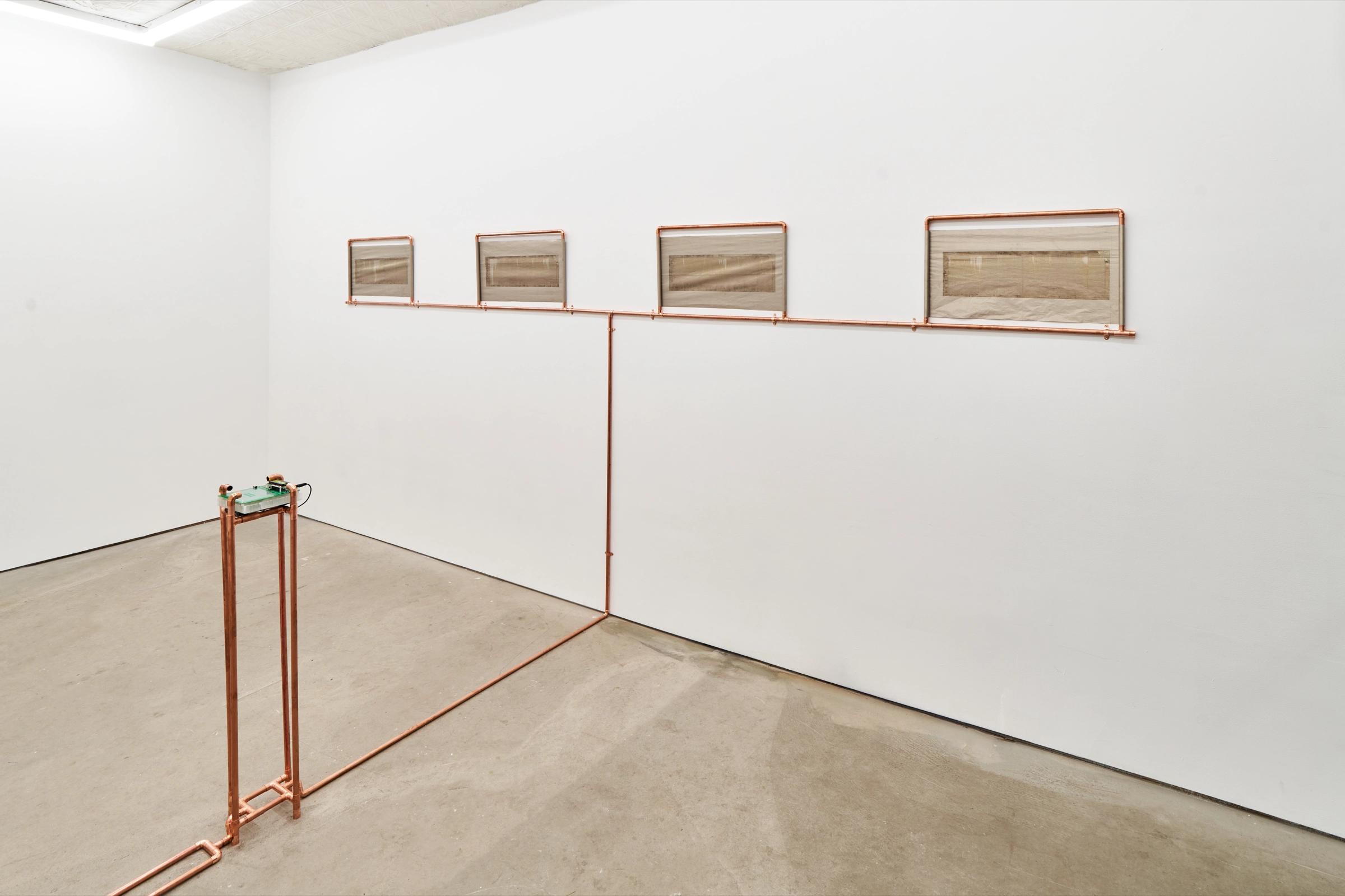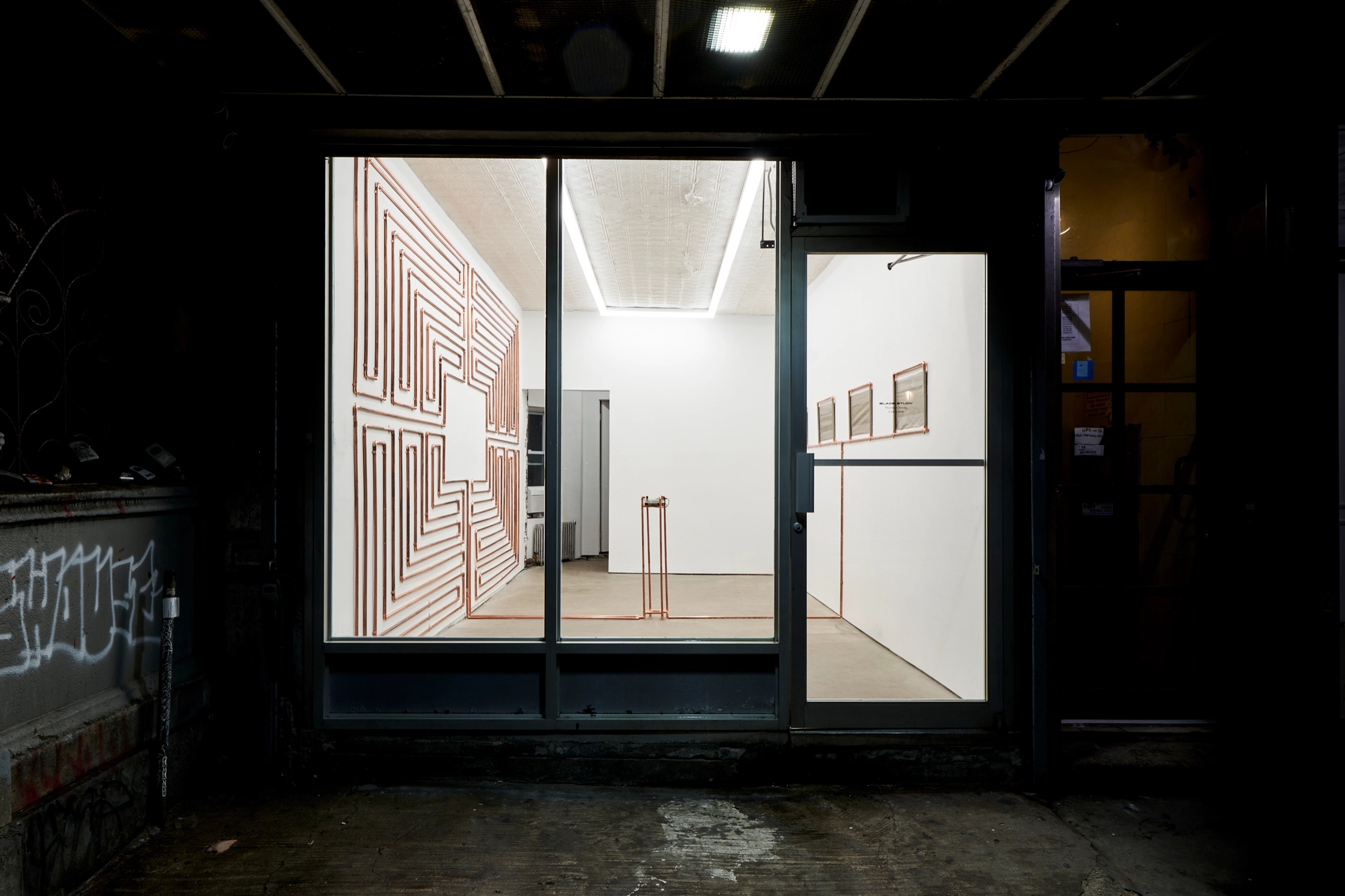 In Koury’s installation, copper pipes serve as natural conduits for this ultra-low resonance, channeling the frequency through an inherently conductive network inspired by both ancient pre-Christian labyrinths and modern hydronic radiant heating systems. Copper’s ability to transfer energy sustains the resonance as it moves through the labyrinthine form, fostering a dynamic interaction between the physical and energetic realms within the space.