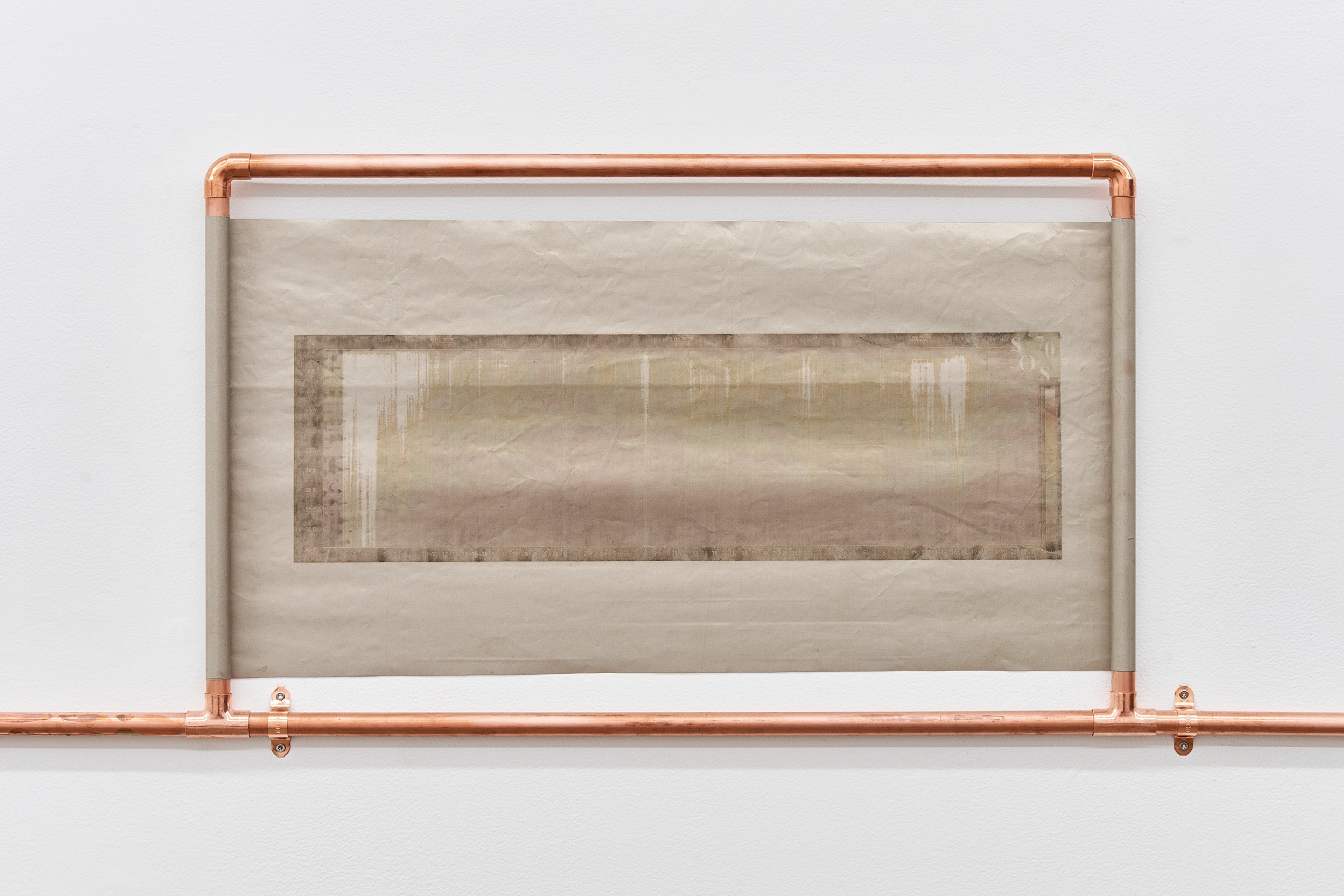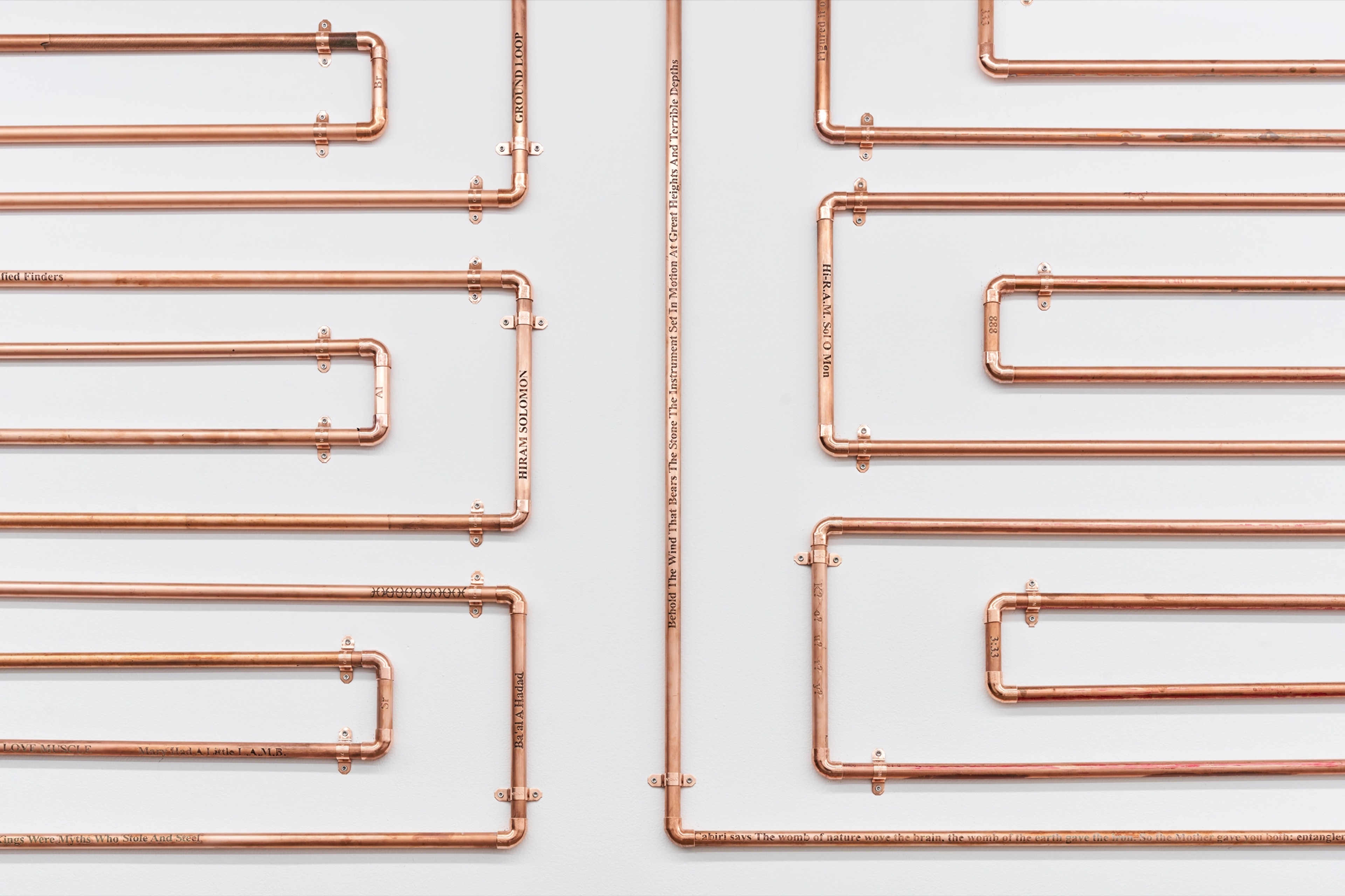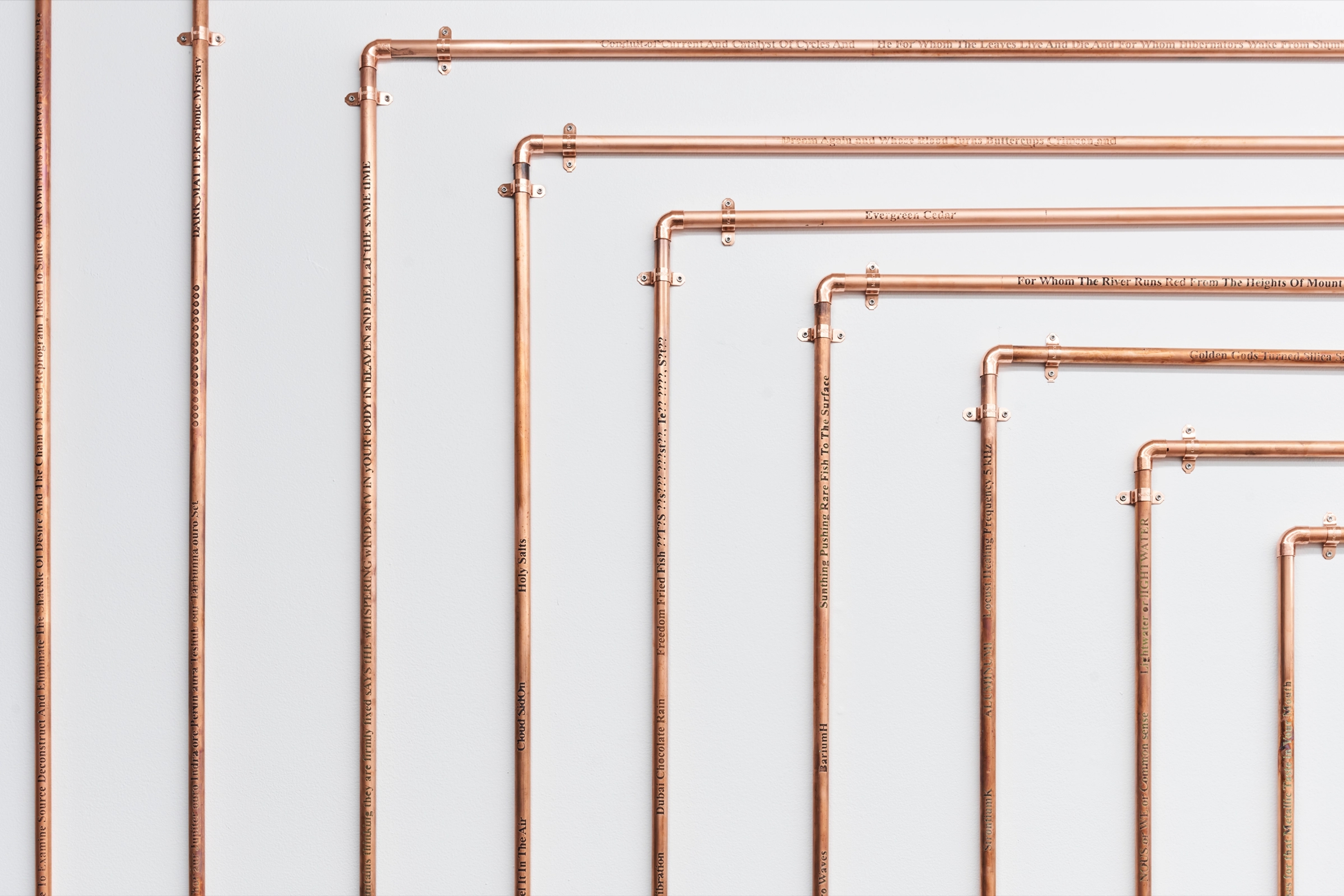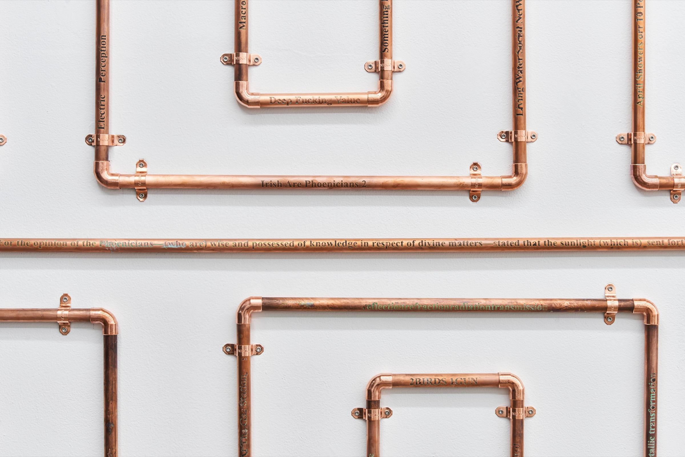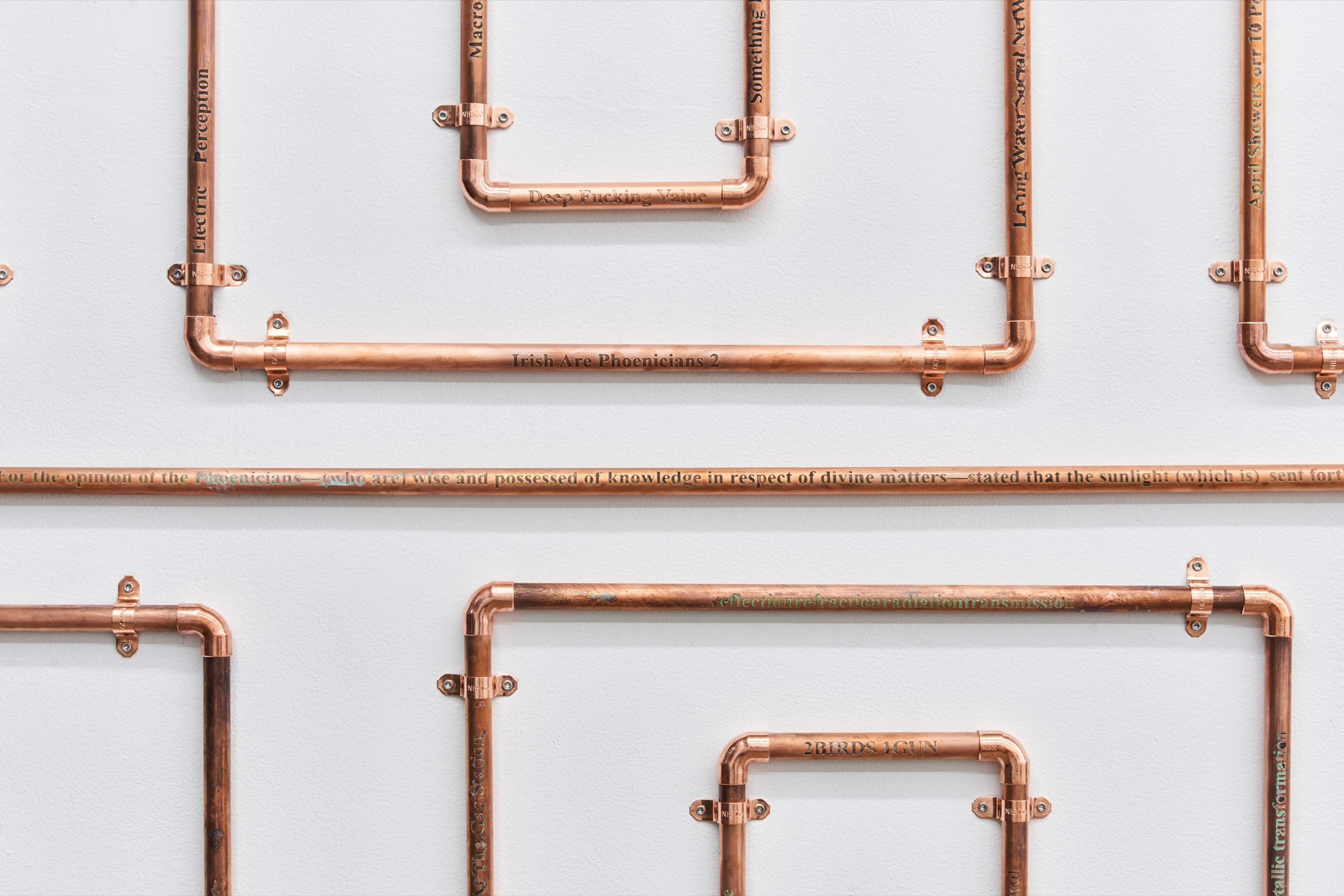 In Koury’s installation, copper pipes serve as natural conduits for this ultra-low resonance, channeling the frequency through an inherently conductive network inspired by both ancient pre-Christian labyrinths and modern hydronic radiant heating systems. Copper’s ability to transfer energy sustains the resonance as it moves through the labyrinthine form, fostering a dynamic interaction between the physical and energetic realms within the space.