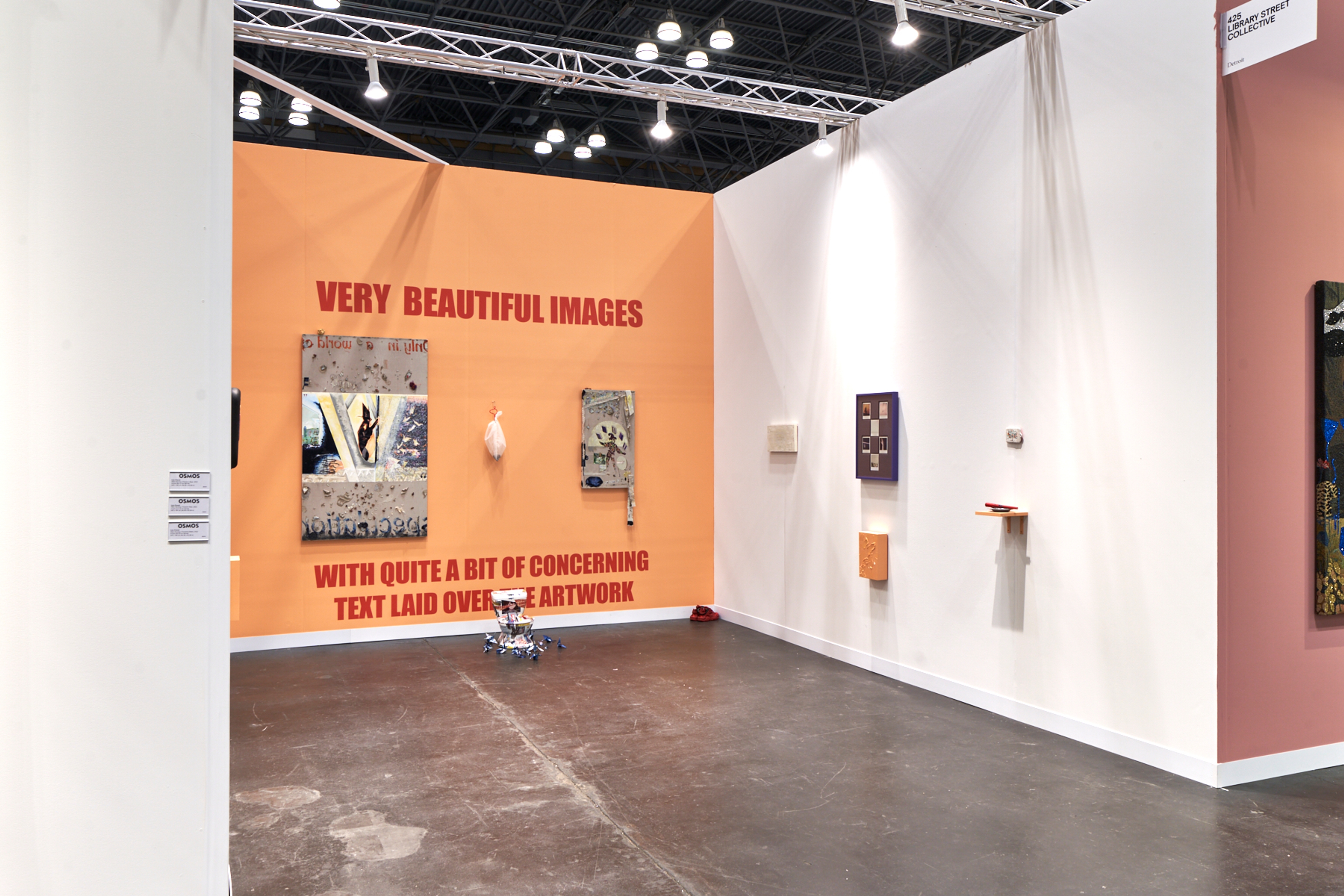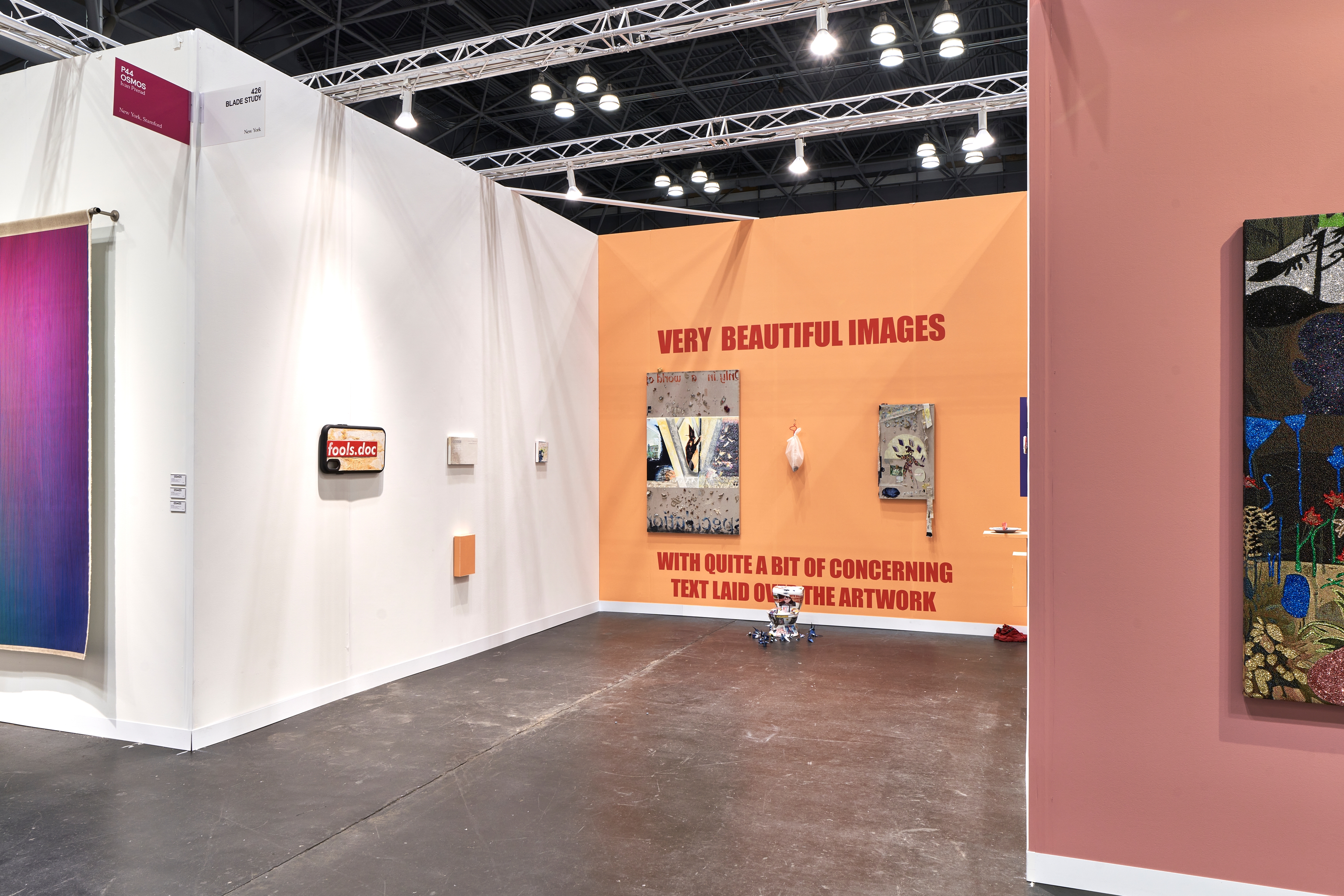 VERY BEAUTIFUL IMAGES is a site of production, reproduction, and circulation of puzzle pieces in an analog culture of the digital. In a nod to the substructure of this revolution, the artist wedges the distinctive architecture of Brooklyn’s Flatbush Avenue Apple store into the center of Only in a world of pure (imagination) speculation (2024), the largest painting on view, where gestural marks textured to resemble peeling skin are pasted onto the surface in a kind of drag-and-dropped expressionism. Together with the 3D-milled fools.doc (2024)—which replicates a used iPhone case—the artist visually puns on the reality of our contemporary way of seeing. And, as in the artist’s critically acclaimed solo exhibition with the gallery last year, this Armory arrangement features works that make use of phosphorescent passages, incorporate collaged references to the artist’s previous installations, and hang artworks at dog’s-eye level.