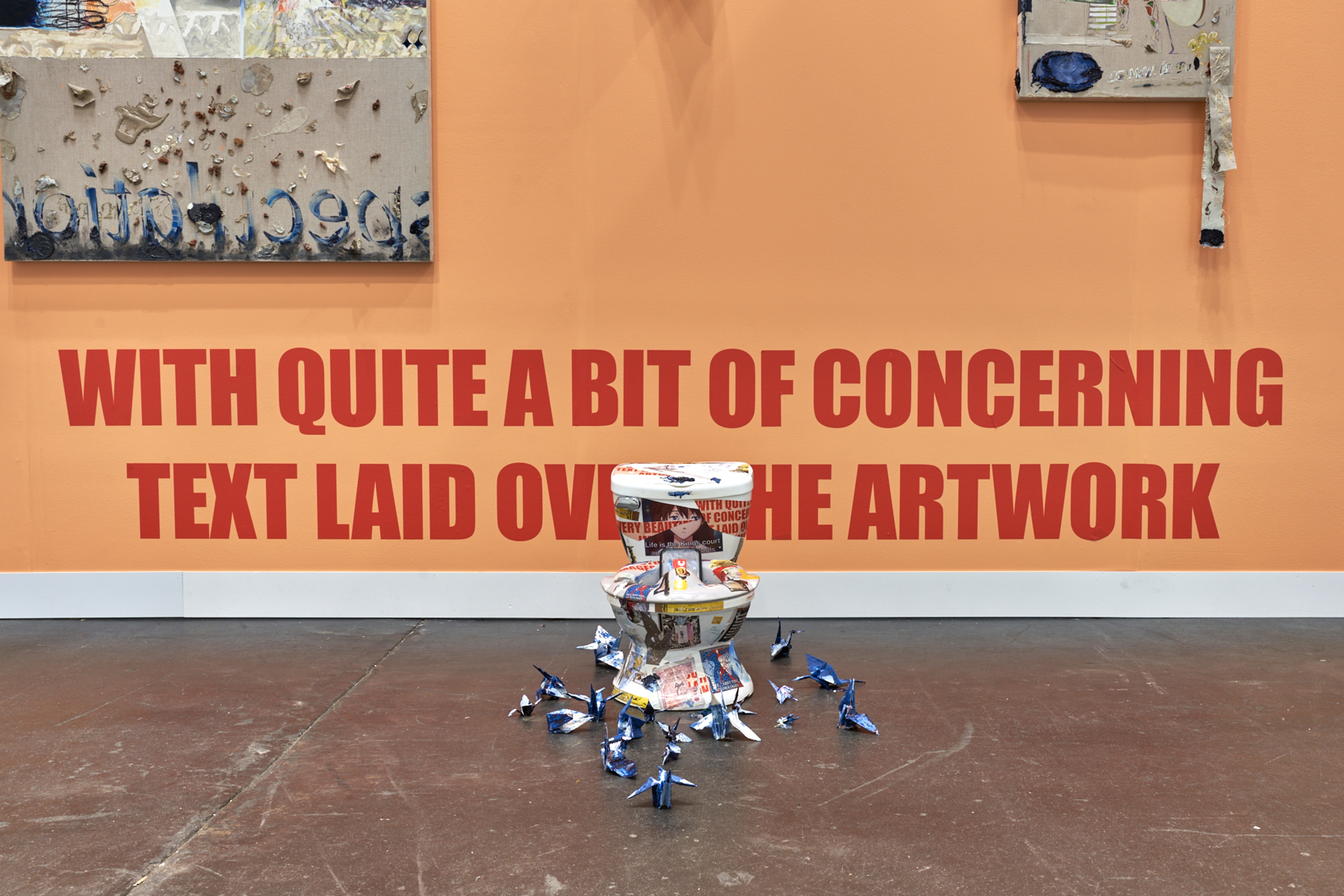 With this history as context, Paige K. B. locates her installations of oil, acrylic, embroidered, printed, and decoupaged paintings at the nexus of visual representation and textual discourse. Blade Study is proud to present for their Gramercy International Prize–winning booth the artist’s new body of work, titled after one potential answer to the question “What is a meme?” The installation of paintings, a suite of personal photographs, and sculptural elements both handmade and readymade stages a conspiratorial encounter between origami cranes, an in-development D.A.R.P.A. aircraft model, the “jester’s privilege” meme, a room on fire, modernist poetry, and the Pantone color of the year for 2024: Peach Fuzz.